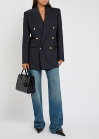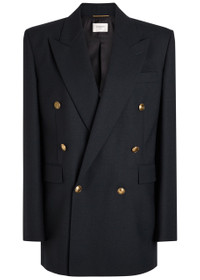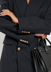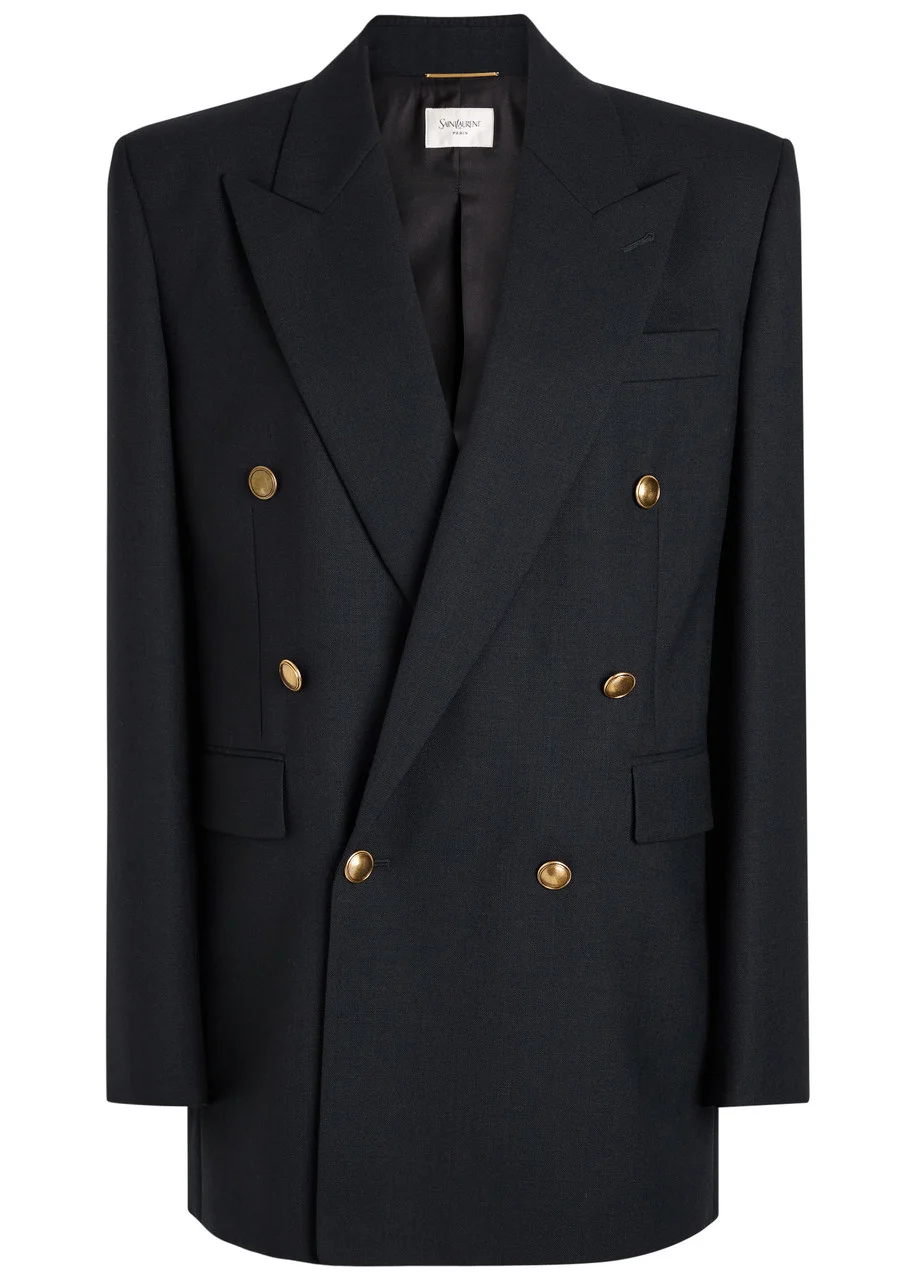 Info & Care Saint Laurent wool blazer Notched lapels, padded shoulders, button-fastening cuffs, chest slit pocket, two front flap pockets, back vents, two internal slit pockets, fully lined Double-breasted button fastenings at front 100% wool; lining: 100% silk Dry clean Size & Fit Length shoulder to hem: 31 inches/ 79cm Midweight Relaxed, longline fit Model is 5'8"/ 173cm and wears a size FR36