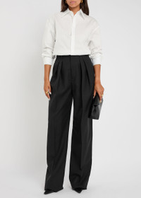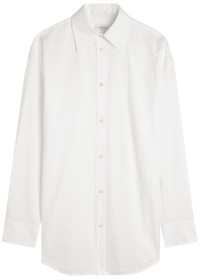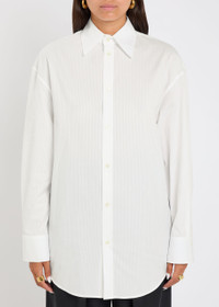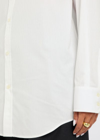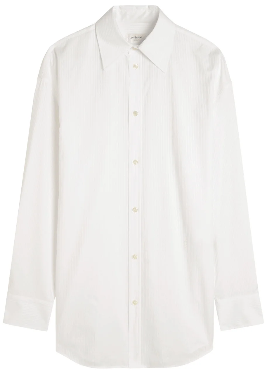 Info & Care Saint Laurent cotton shirt Subtle striped jacquard, dropped shoulders, button-fastening cuffs, logo embroidery at front, curved hem Button-fastenings through front 100% cotton Dry clean Size & Fit Length shoulder to hem:;30.5 inches/ 77cm Midweight Relaxed fit Model is 5'8"/ 173cm and wears a size FR36