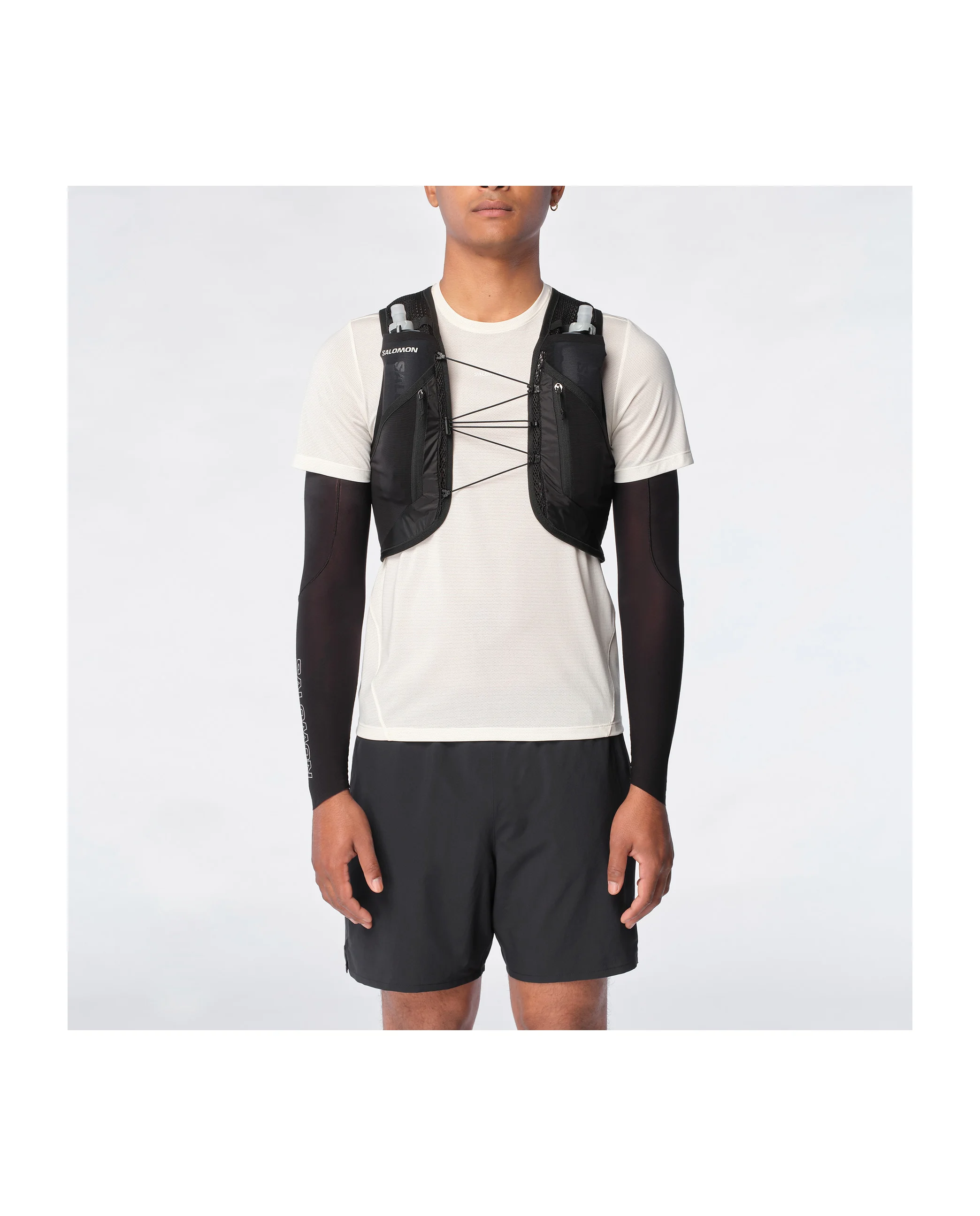 To provide a stepping stone to take your trail running to the next level for ultra-distances, we launched the ACTIVE SKIN 12 – the biggest volume yet in this range. The fabrics are soft and breathable, the fit is ultra-secure, and the chest pockets provide effortless access to your flasks. FEATURES & FABRICS - CONCEPT & TECHNOLOGY - Sensifit™: The construction uses stretch, breathable fabrics and lightweight adjustments to optimize fit and stability. - LOAD MANAGEMENT - Quick link: This sternum strap enables you to adjust your pack quickly on the fly. The elastic makes it easier to breathe when you pick up the pace. - HYDRATION: 2 soft flasks 500 ml 28 included - BACK SYSTEMS: 3D comfort - LOAD MANAGEMENT: Side compression laces adjustable - SHOULDER STRAPS - 3D Airmesh shoulder straps: With a construction that incorporates small cavities, 3D Airmesh panel allows enhanced air circulation. - HYDRATION - Reservoir compartment: This item contains an internal reservoir compartment with a hanging strap to hold the reservoir in place. - HYDRATION - Reservoir tube exit: Sewn-in exit port for a hydration tube. - HYDRATION: Compatible with 1.5l reservoir - POCKETS & COMPARTMENTS: 1 back compartment - POCKETS & COMPARTMENTS: 1 internal pocket - POCKETS & COMPARTMENTS - 2 front stretch pockets: Expandable front pockets to store essentials you want to access on the go. - POCKETS & COMPARTMENTS - 2 front zipped pockets: Ideal for more accessible volume - POCKETS & COMPARTMENTS: 1 back expandable mesh pocket - OPENING & CLOSURE - Large opening: Salomon bags have a large opening to make it easy to see and store your gear. - CARRYING SYSTEM - Custom quiver compatible: Upgrade your pack with the custom quiver, providing quick access and stable carrying for your poles. It's ready to connect. - CARRYING SYSTEM - Custom quiver connecting system: Hooks on the quiver connect to loops on the Sense packs. - CARRYING SYSTEM - Key holder: This elastic key chain holder makes it easy to pull keys off the bag while remaining safely attached. - FABRICS - 3D air mesh: Soft 3D mesh adapts to your body on the move, without rubbing your skin or tee-shirt. Larger holes maximize comfort and breathability. - FABRICS - Elastic power mesh: Highly stretch and breathable fabric that adapts to the body. - FABRICS - Fast wicking fabrics: Improving quick drying and moisture management, these light fabrics deliver top performance, comfort, and odor resistance. Back insert 89% Polyamide, 11% Elastane Body insert 88% Polyamide, 12% Elastane Back body 100% Polyester Lining 100% Polyamide Body 100% Polyamide Article ref. LC2177400