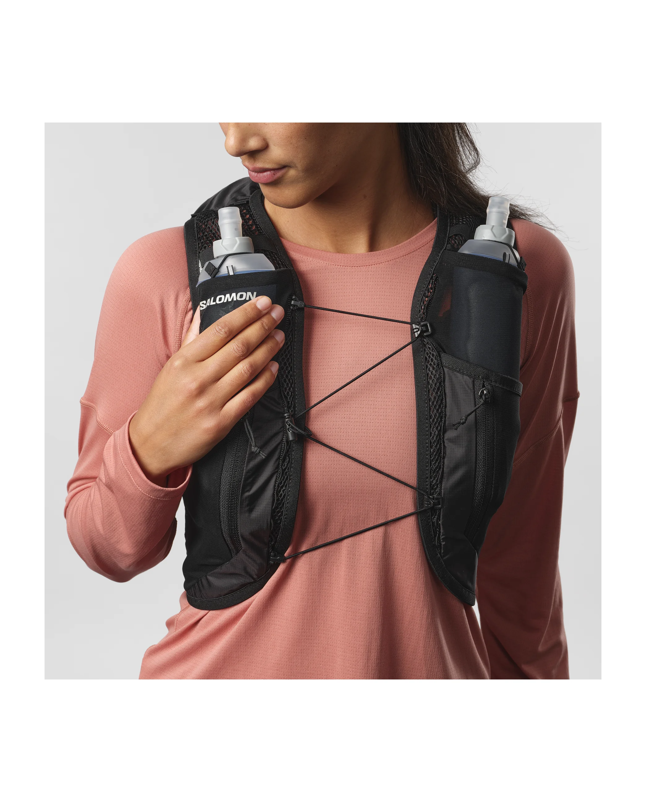 To provide a stepping stone to take your trail running to the next level for ultra-distances, we launched the women's ACTIVE SKIN 12 – the biggest volume yet in this range. The fabrics are soft and breathable, the fit is designed for women, and chest pockets provide effortless access to your flasks. FEATURES & FABRICS - CONCEPT & TECHNOLOGY - Sensifit™ women specific: Adapted to women’s morphology, the design uses stretch, breathable fabrics and lightweight adjustments, including double-stretch chest straps, to optimize fit and stability. - LOAD MANAGEMENT - Quick link: This sternum strap enables you to adjust your pack quickly on the fly. The elastic makes it easier to breathe when you pick up the pace. - HYDRATION: 2 soft flasks 500 ml 28 included - BACK SYSTEMS: 3D comfort - LOAD MANAGEMENT: Side compression laces adjustable - SHOULDER STRAPS - 3D Airmesh shoulder straps: With a construction that incorporates small cavities, 3D Airmesh panel allows enhanced air circulation. - HYDRATION - Reservoir compartment: This item contains an internal reservoir compartment with a hanging strap to hold the reservoir in place. - HYDRATION - Reservoir tube exit: Sewn-in exit port for a hydration tube. - HYDRATION: Compatible with 1.5l reservoir - POCKETS & COMPARTMENTS: 1 back compartment - POCKETS & COMPARTMENTS: 1 internal pocket - POCKETS & COMPARTMENTS - 2 front stretch pockets: Expandable front pockets to store essentials you want to access on the go. - POCKETS & COMPARTMENTS - 2 front zipped pockets: Ideal for more accessible volume - POCKETS & COMPARTMENTS: 1 back expandable mesh pocket - OPENING & CLOSURE - Large opening: Salomon bags have a large opening to make it easy to see and store your gear. - CARRYING SYSTEM - Custom quiver compatible: Upgrade your pack with the custom quiver, providing quick access and stable carrying for your poles. It's ready to connect. - CARRYING SYSTEM - Custom quiver connecting system: Hooks on the quiver connect to loops on the Sense packs. - CARRYING SYSTEM - Key holder: This elastic key chain holder makes it easy to pull keys off the bag while remaining safely attached. - FABRICS - 3D air mesh: Soft 3D mesh adapts to your body on the move, without rubbing your skin or tee-shirt. Larger holes maximize comfort and breathability. - FABRICS - Elastic power mesh: Highly stretch and breathable fabric that adapts to the body. - FABRICS - Fast wicking fabrics: Improving quick drying and moisture management, these light fabrics deliver top performance, comfort, and odor resistance. Body insert 88% Polyamide, 12% Elastane Back insert 89% Polyamide, 11% Elastane Lining 100% Polyamide Body 100% Polyamide Back body 100% Polyester Article ref. LC2178600