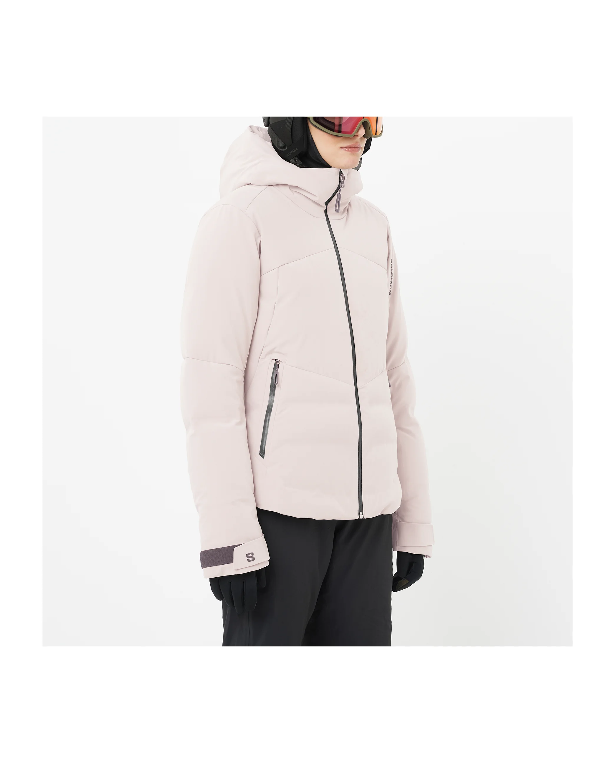 Our Salomon ALPENFLOW down jacket combines cozy insulation and a versatile baffled design. Ready to take you from a clear, cold day on the slopes to a winter commute in the heart of the city. - Best for Everyday use, Skiing, Snowboarding , Breathable, Down insulation, Waterproof, Water repellent treatment, Windproof - Weight : 1000 g - Fit : Regular - Key Technology : AdvancedSkin Dry Features & Fabrics - 2L : A bonded fabric and membrane form one layer, often needing a lining for added comfort and performance. - 2 Way stretch fabric : Stretching in 2 directions, this fabric provides freedom to move effortlessly while maintaining stability and comfort. - Hood with 3D adjustment : Personalize your hood to fit the height and depth of your head with cinch cord, ensuring a custom fit for maximum comfort and protection - Fixed hood : The hood is securely attached to the garment for a seamless, comfortable fit. - Powder skirt : A built-in snow skirt keeps snow out of your jacket, ensuring you stay warm and dry in any conditions. - Regular fit : On tops and bottoms, Regular fit is a wider fit than slim fit, but more fitted than relaxed fit. - YKK® water-resistant zippers : YKK® water-resistant zippers provide reliable, smooth performance while keeping moisture out, ensuring enhanced protection - 2 zipped hand pockets : A perfect balance of protection and security, offering a comfortable space for your hands while keeping your essentials safe and within reach. - Goggle mesh pocket : An internal mesh pocket to store your goggles. - Inner media pocket : Built-in media pocket with a headphone slot for easy access, keeping your devices safe and your music close on every ride - Lift pass pocket with goggle wipe : Keep your ski pass within easy reach with a dedicated pocket, featuring a built-in goggle wipe for clear vision on the slopes - Velcro cuff adjustment : Customise the fit of your cuff in seconds, to ensure a perfect seal to keep the cold the rain or the wind out. - Stretch cuffs : Streamlined cuff design for a snug fit around the wrist - 650 fillpower : Fill power measures the loft and insulation of down. The higher the fill power, the more warmth it provides while staying lightweight and compressible. - Down insulation 90/10 : Down offers the best warmth-to-weight ratio (90/10), delivering exceptional insulation without bulk; ideal for maximum comfort and performance in cold conditions - PFC-Free DWR : The PFC-free durable water-repellent finish keeps you dry while reducing environmental impact. Benefits : Breathable, Down insulation, Waterproof, Water repellent treatment, Windproof Care & Durability - Wash with like colours - Cool iron - Do not bleach - Do not dry clean - Machine wash cold (30°c) - Tumble dry low - Do not use fabric softener - Remove immediately - Tumble dry low with 4 tennis balls Article ref. LC2620500