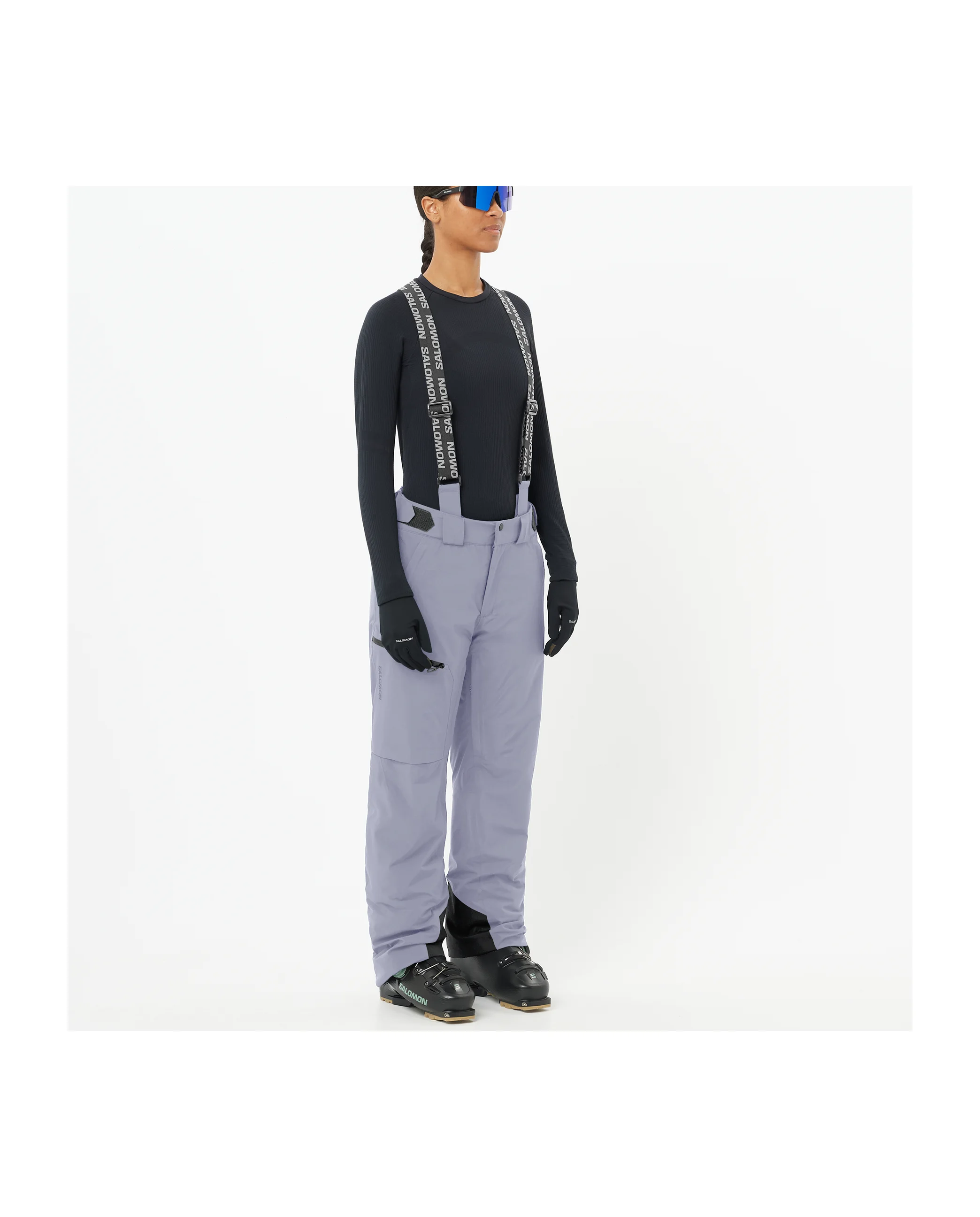 Designed to complement the Brilliant jacket, Salomon's Brillant women's pants are equipped with all the essential features skiers and snowboarders need when hitting the slopes. They offer exceptional protection and comfort with their waterproof and breathable stretch fabric, ensuring you stay dry and comfortable in any weather. - Best for Skiing, Snowboarding , Breathable, Synthetic insulation, Waterproof, Water repellent treatment, Windproof - Weight : 720 g - Fit : Regular - Key Technology : AdvancedSkin Dry, PrimaLoft® Features & Fabrics - AdvancedSkin Dry : AdvancedSkin Dry Technology keeps you dry and protected from the elements, while its breathable membrane ensures optimal comfort by letting moisture escape. - PrimaLoft® : PrimaLoft® insulation delivers exceptional warmth and comfort while remaining soft and highly compressible. Designed for outdoor enthusiasts seeking performance. - 2 Way stretch fabric : Stretching in 2 directions, this fabric provides freedom to move effortlessly while maintaining stability and comfort. - Regular : A good choice for those who want a more classic and traditional look, with little bit of room to move and be comfortable during the activity. - Removable suspenders : Enjoy versatility and comfort with adjustable, detachable suspenders for the best fit. - Drawcord waist adjustment : Achieve the perfect fit with ease, adjusting your waist for personalized comfort and total freedom of movement. - Inner air vent system : Optimized airflow for perfect temperature control, keeping you comfortable and focused throughout your activity. - Reinforced inside leg : Reinforced pant hems provide durable protection against abrasion from ski boots and cuts from ski edges, ensuring longevity and resistance - 2 zippered hand pockets : Cozy pockets to keep your hands warm, whether braving the cold or seeking extra comfort. - 1 zipped thigh pocket : Secure and practical, the zipped thigh pocket keeps your essentials within easy reach - AdvancedSkin Dry 20K/20K : AdvancedSkin Dry 20K/20K offers ultimate protection from rain, snow, and wind while allowing moisture to escape, ensuring comfort with 20,000mm waterproofing and breathability. - PrimaLoft® Black Eco 60g/m² : PrimaLoft® Black Eco 60g/m² offers lightweight warmth made from recycled materials. Breathable, water-resistant, and ultra-compressible. Bottom length : Long Care & Durability - Do not iron print - Wash with like colours - Cool iron - Do not bleach - Do not dry clean - Machine wash cold (30°c) - Tumble dry low - Do not use fabric softener - Remove immediately - Wash with fasteners closed Article ref. LC2636700
