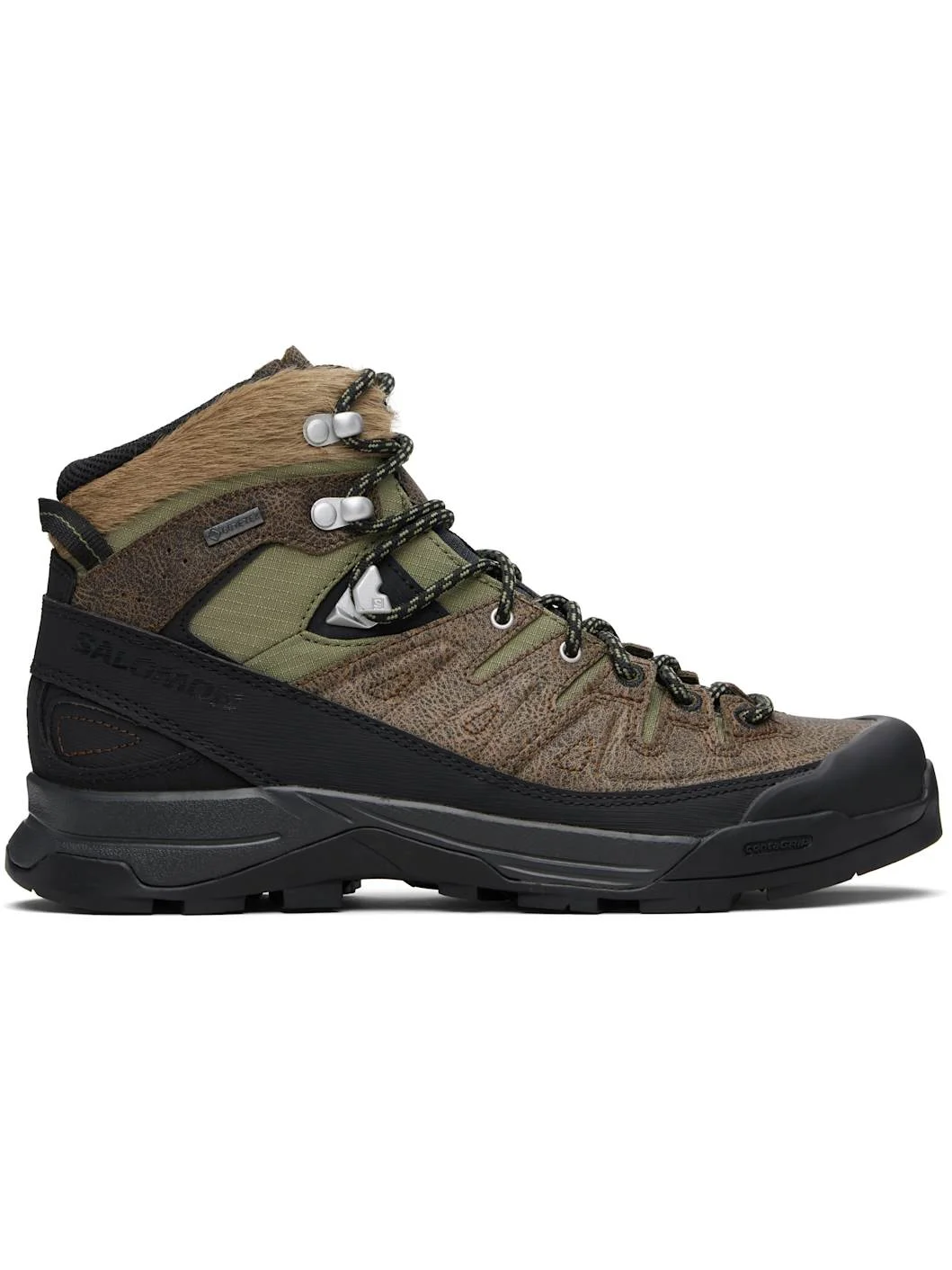 Ankle-high coated grained leather and GORE-TEX™ ripstop boots. · Rubber cap toe · Lace-up closure · Padded tongue and collar · Hair-on leather trim at collar · Pull-loop at heel collar · Fur trim at heel counter · Logo hardware and printed logo at outer side · Molded OrthoLite® footbed · Mesh lining · EnergyCell rubber midsole · Treaded All Terrain contaGRIP® rubber sole Supplier color: Dark Earth/Black Upper: leather, textile, synthetic. Sole: rubber. Made in Viet Nam 252837F113000