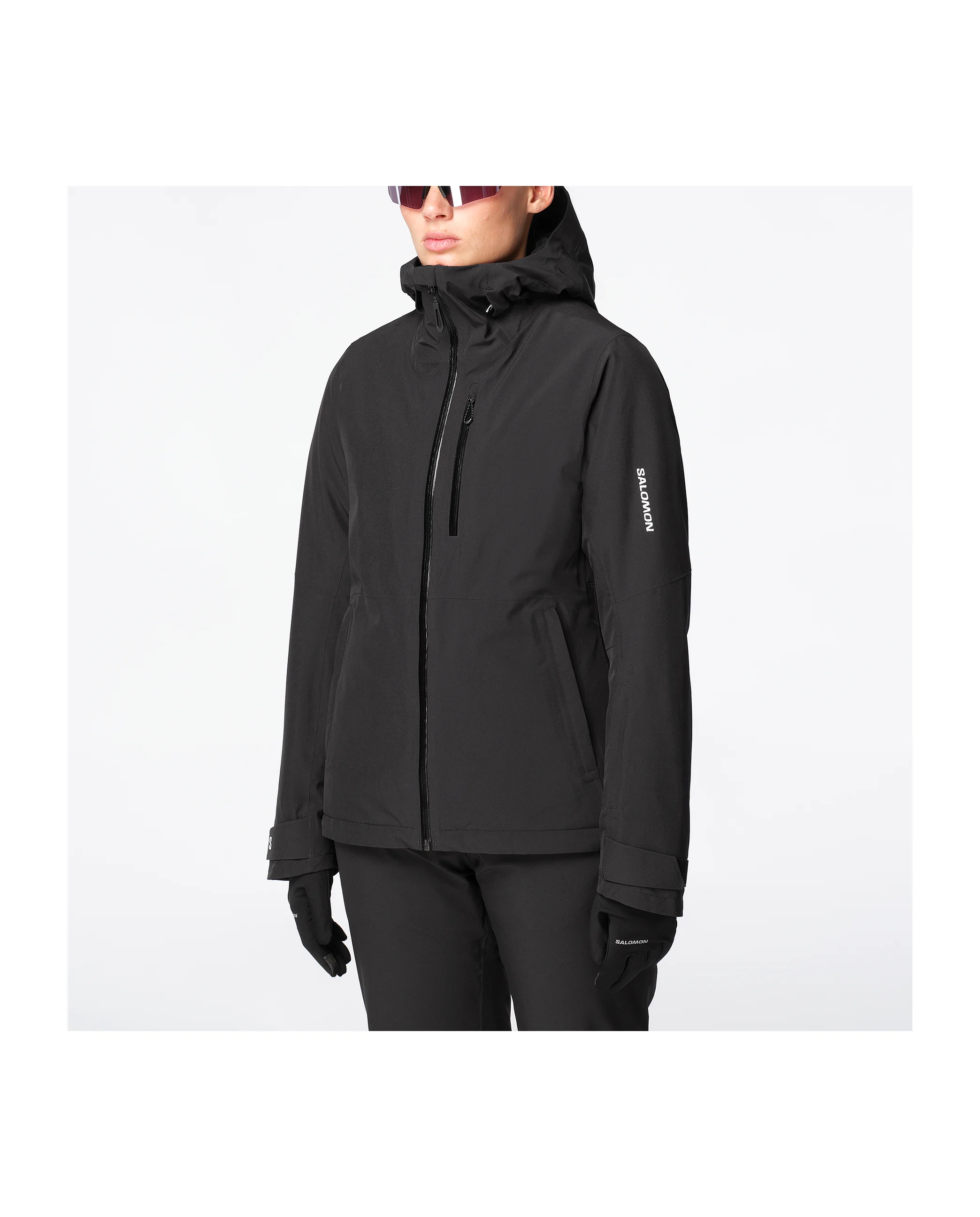 Our women’s HIGHLAND jacket rolls together everything you need in the snow, from waterproof stretch fabric to cozy PrimaLoft® insulation. So, you can ride your way around the mountain feeling dry, protected and ready for anything winter throws your way. FEATURES & FABRICS - CONCEPT & TECHNOLOGY - AdvancedSkin Dry: AdvancedSkin Dry Technology protects you from rain, snow and wind from the outside, while providing breathability through the membrane, which keep you comfortable. - CONCEPT & TECHNOLOGY - PrimaLoft®: PrimaLoft® insulation provides warmth and comfort, and is soft and highly compressible. PrimaLoft® products meet specific needs for outdoor enthusiasts and sportsmen. - HOOD - Adjustable hood: A hood with a smart adjustment to fit to your head. - BODY - Goggle wipe: Attached inside your pocket, this convenient goggle wipe is always ready to clean your lenses. - BODY - Powder skirt: An integrated skirt to prevent snow from entering in your jacket. - BODY - Air vent system: Salomon air vents are easy to open, allowing maximum air flow. - FIT - Regular fit: On tops and bottoms, Regular fit is a wider fit than slim fit, but more fitted than relaxed fit. - ZIP - Waterproof zip: Completely waterproof when zipped closed, waterproof zippers are essential to waterproof apparel or bags. - POCKETS - 1 internal pocket: A secure pocket inside the garment or inside another pocket. - POCKETS - 1 large mesh pocket: A larger pocket that fits close to the body, for larger stuff. - POCKETS - 1 zipped chest pocket: An easy, accessible pocket with secure zip closure. - POCKETS - 2 zipped hand pockets: Roomy pockets to keep your hands warm, with secure, zipped closure. - POCKETS - Lift pass pocket: functional, hands-free, pass pocket to that can be read easily at the bottom of the lift. - SLEEVES - Cuff adjustment: Easy, simple way to adjust the cuffs around gloves. - SLEEVES - Stretch cuffs: Minimal cuff construction to fit close to the wrist. - WATERPROOFNESS - AdvancedSkin Dry 10K/10K: It protects you against rain, snow and wind, but allows moisture vapor to escape and keep you comfortable. It provide 10 000 mm waterproofness and breathability of 10 000 g/m²/24h. - INSULATION - PrimaLoft® 100g/m²: A high-performance synthetic insulation with high warmth-to-weight and loft. Insulates even when wet. - SUSTAINABILITY: PrimaLoft® Black Eco 100g/m² - SUSTAINABILITY: PFC-Free DWR Benefits Waterproof, Breathable Body 91% Polyester, 9% Elastane Lining insert 100% Polyester Padding 100% Polyester Article ref. LC2353800