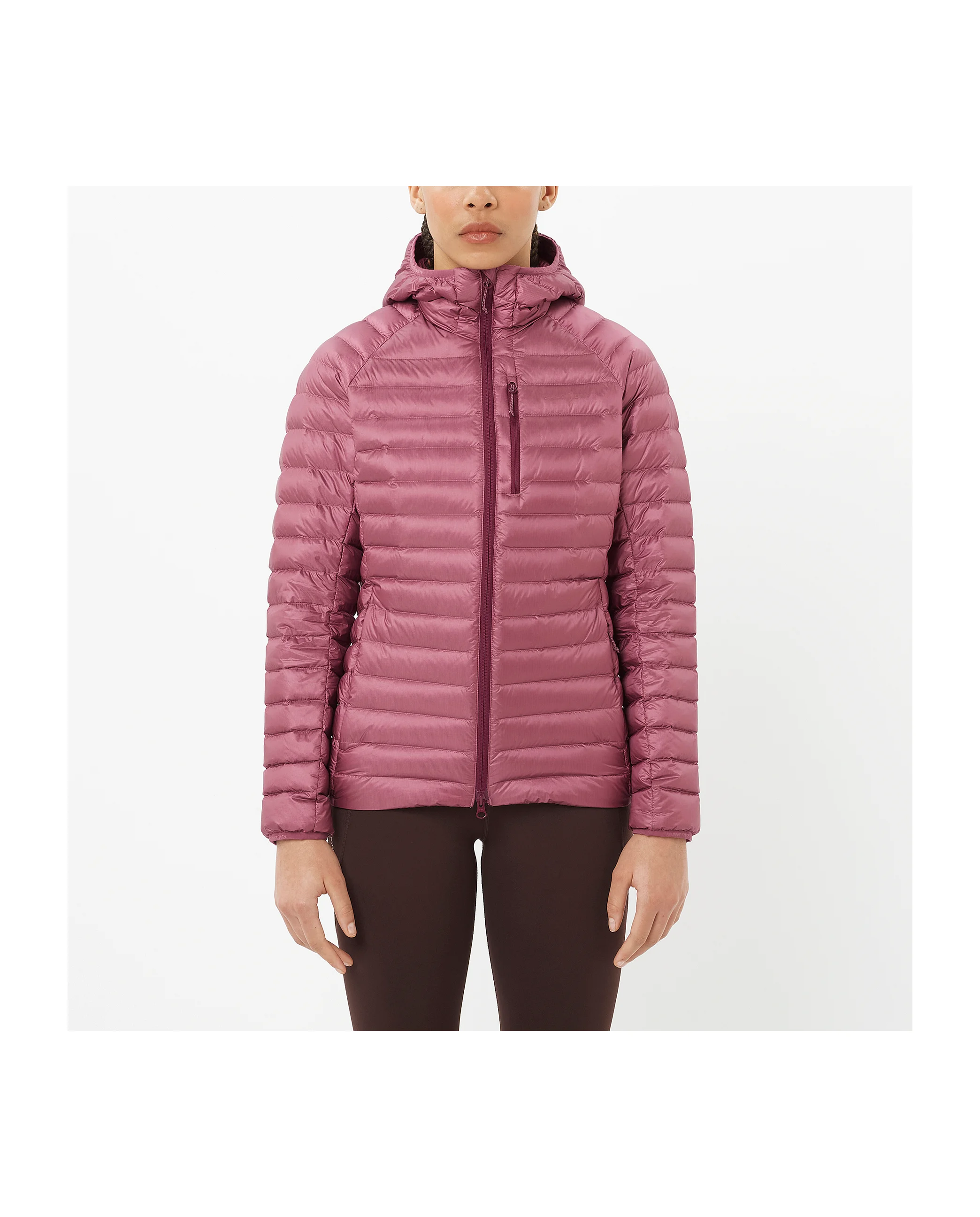 Our women’s Salomon Elixir Micro Down hooded jacket is designed for ultra-light warmth during all your favorite mountain activities. HeiQ XReflex™ technology powered by Xefco and bodymapped 800 fill power down make this one of our lightest and warmest jackets – that’s effortless to pack away. Ready to take on steep paths and powdery slopes. - Best for Everyday use, Hiking, Skiing, Snowboarding, Winter adventure , Breathable, Down insulation, Packable - Weight : 284 g - Activities : Everyday use, Hiking, Skiing, Snowboarding, Winter adventure - Fit : Regular - Key Technology : HeiQ XReflex™ powered by Xefco - Benefits : Breathable, Down insulation, Packable Features & Fabrics CONCEPT & TECHNOLOGY - HeiQ XReflex™ powered by Xefco : Efficient warmth with less bulk, HeiQ XReflex™ is a radiant barrier technology that reflects body heat, enhancing insulation while maintaining breathability HOOD - Fixed hood : The hood is securely attached to the garment for a seamless, comfortable fit. ZIP - Water repellent center front zip POCKETS - Zippered chest pocket : A practical, zipped closure to keep your must-haves secure and always within reach. - 2 zipped hand pockets : A perfect balance of protection and security, offering a comfortable space for your hands while keeping your essentials safe and within reach. VISUAL ASPECT - Reflective branding : Designed with reflective branding to keep you visible in low-light conditions. INSULATION - 800 fillpower : Fill power is a measure of the loft of a down product. The higher the fill power, the more air an ounce of the down can trap, and thus the more insulating ability. - Down insulation 90/10 : Down offers the best warmth-to-weight ratio (90/10), delivering exceptional insulation without bulk; ideal for maximum comfort and performance in cold conditions SUSTAINABILITY - PFC-Free DWR : The PFC-free durable water-repellent finish keeps you dry while reducing environmental impact. Benefits : Breathable, Down insulation, Packable Care & Durability - Machine wash (30°c delicate) - Do not bleach - Do not dry clean - Tumble dry low - Do not use fabric softener - Do not iron - Tumble dry low with 4 tennis balls - Wash separately Article ref. LC2646800