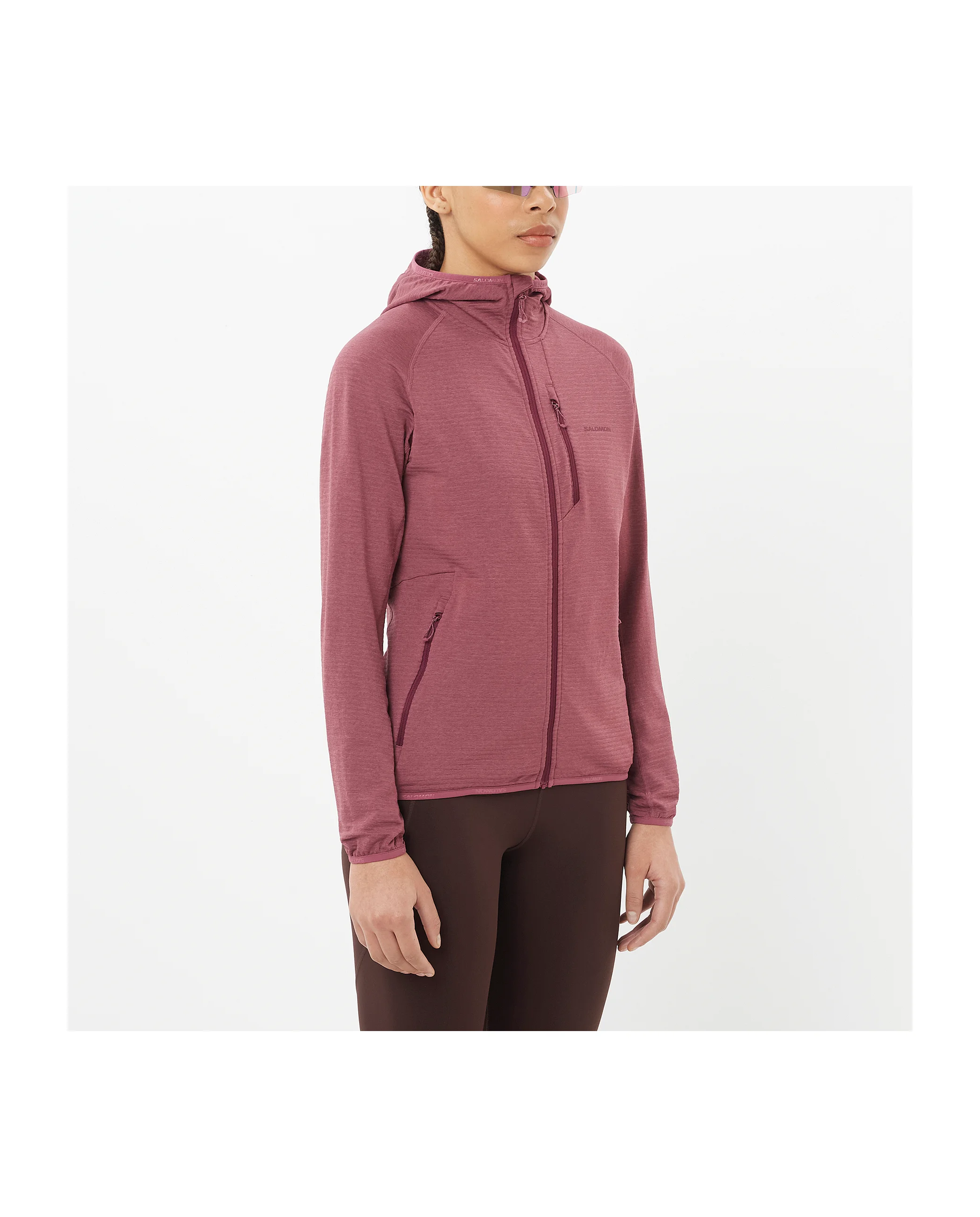 Our women’s Salomon ESSENTIAL LIGHTWARM full-zip hoodie makes a great midlayer for all your winter activities, from hiking to skiing. It keeps you warm, wicks away moisture and lets air circulate, so you feel comfy all day. From the mountain to forest and city. - Best for Everyday use, Hiking, Winter adventure , Breathable, Stretchy - Weight : 254 g - Activities : Everyday use, Hiking, Winter adventure - Fit : Slim - Key Technology : AdvancedSkin Warm - Benefits : Breathable, Stretchy Features & Fabrics FABRICS - 4-way stretch fabric : Stretching in 4 directions, this fabric provides freedom to move effortlessly while maintaining stability and comfort. HOOD - Fixed hood : The hood is securely attached to the garment for a seamless, comfortable fit. FIT - Slim fit HEM - Hem binding : Reinforced material at the bottom hem of the leg prevents moisture and dirt from entering, and improves the durability of the product. ZIP - Full zip : Full-length zip for easy on and off, plus adjustable ventilation for optimal comfort. POCKETS - Zippered chest pocket : A practical, zipped closure to keep your must-haves secure and always within reach. - 2 zippered hand pockets : Cozy pockets to keep your hands warm, whether braving the cold or seeking extra comfort. VISUAL ASPECT - Chest logo : The distinctive chest logo, adds a signature touch to your style. A statement of identity, designed for impact and recognition SLEEVES - Cuff binding : Stretch sleeve hem adjustment. Benefits : Breathable, Stretchy Care & Durability - Wash with like colours - Do not bleach - Do not dry clean - Machine wash cold (30°c) - Tumble dry low - Do not use fabric softener - Do not iron Article ref. LC2657300