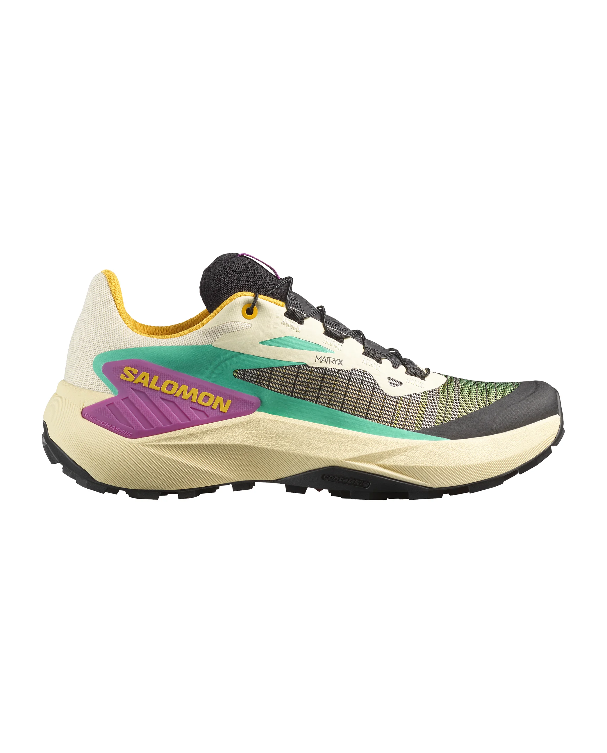 No matter the trail, the Genesis is your go-to shoe for any adventure. Designed to deliver an unmatched running experience, it combines dynamism, comfort, and precision—no matter the terrain. With its durable Matryx® upper and a high-grip outsole built for the toughest conditions, you can count on the Genesis to keep you confident and secure. - Best for Mixed terrain, Rocky , 2-3 runs per week - Cushioning : Moderate - Shoe Width : Standard - Drop : 8 mm - Running Terrain : Mixed terrain, Rocky - Weight : 234 g - Lug depth : 4,5 mm Features & Fabrics - All Terrain Contagrip® : Our All Terrain Contagrip® is built for the widest variety of surfaces. It delivers durability & confidence on wet, dry, hard or loose surfaces. - optiFOAM : Lightweight & cushioned EVA foam for a performance usage. - activeCHASSIS™ : A chassis for increased guidance, uncompromised agility and fluid freedom of movement. - Matryx® : A high-performance textile designed to resist abrasion with individually-coated high-tenacity Kevlar® and technical yarn – that also make it light and breathable. - EndoFit™ : An internal fit sleeve designed to hug the foot in exactly the right places and provide a precise fit. - quickLACE™ : Minimalistic and strong lace for one-pull tightening. Easy-on, easy-off. - Recycled material : Materials made from recycled products such as PET bottles or material waste Lacing system : Quicklace® Lining : Textile Inlay sole : Textile Outsole : Rubber Upper (MCL) : Synthetic / Textile Article ref. L47862400