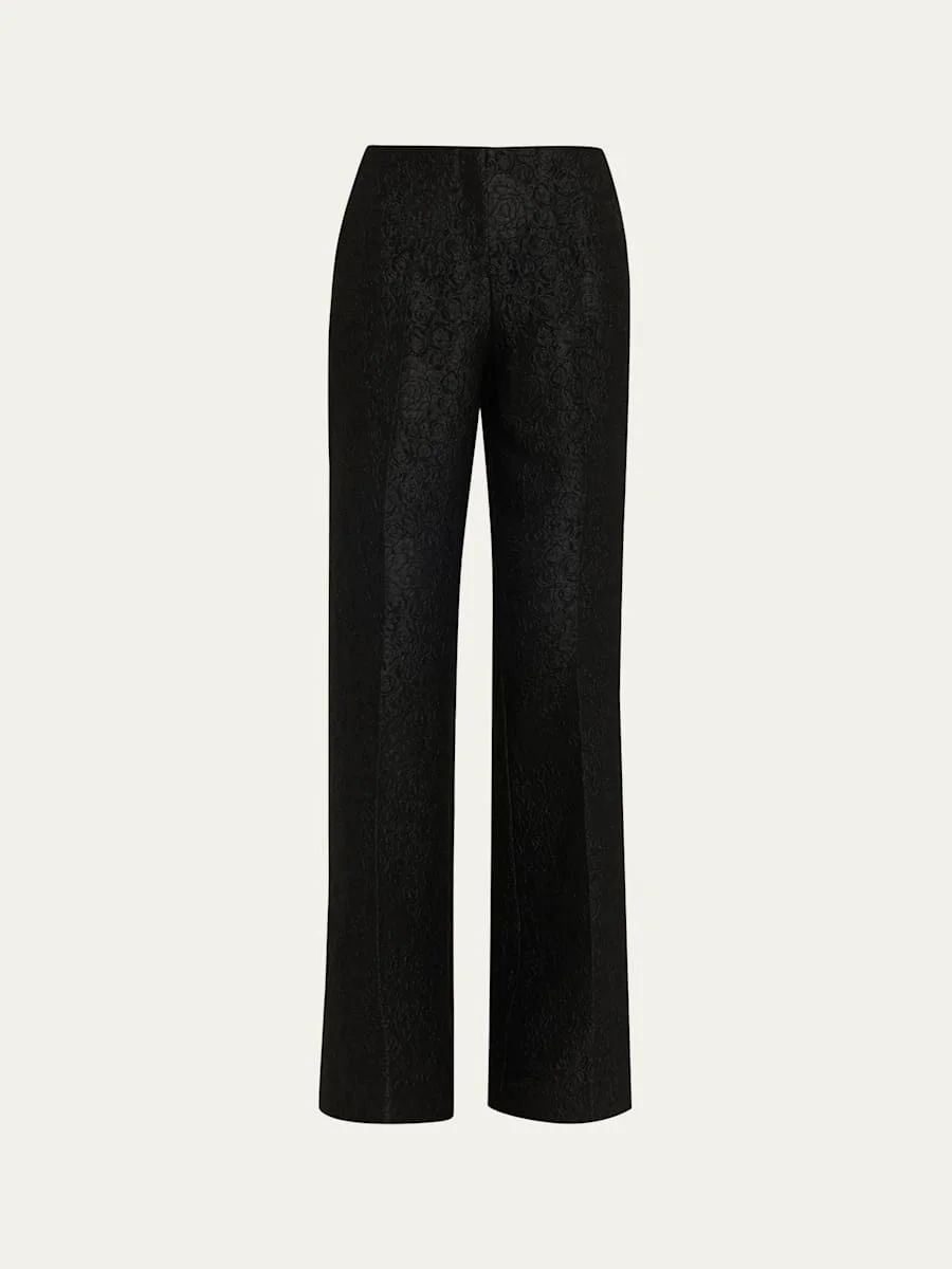 Crafted in rose brocade, the "FluteB" trousers by Saloni offer a sleek silhouette with a feminine touch. High rise Side pockets Fitted through the hip and thigh Full length Hook/zip fly Polyester/spandex Dry clean only Imported