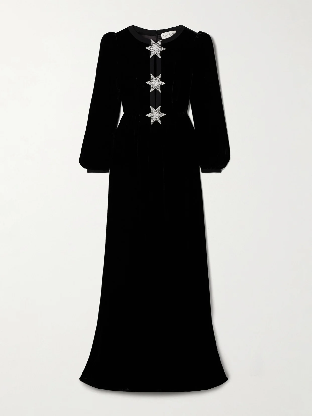 Inspired by vintage styles, Saloni's glamorous 'Camille' gown has an alluring split neckline held together by three decorative star-shaped embellishments, each densely embellished with faux pearls, iridescent beads and glistening crystals. The nostalgic silhouette is cut from lustrous black velvet spun with touches of silk for added softness, and has romantic blouson sleeves. Wear yours to festive parties with pumps.