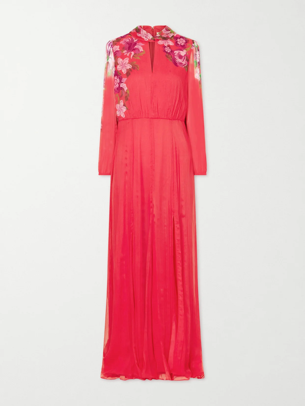 Saloni's 'Jaclyn' long dress captures the brand's romantic sensibility through a fluid lens. Cut from silk-crepon, the floor-length silhouette has a softly gathered bodice, sheer sleeves, and a gently flared skirt, while floral motifs add depth and movement.