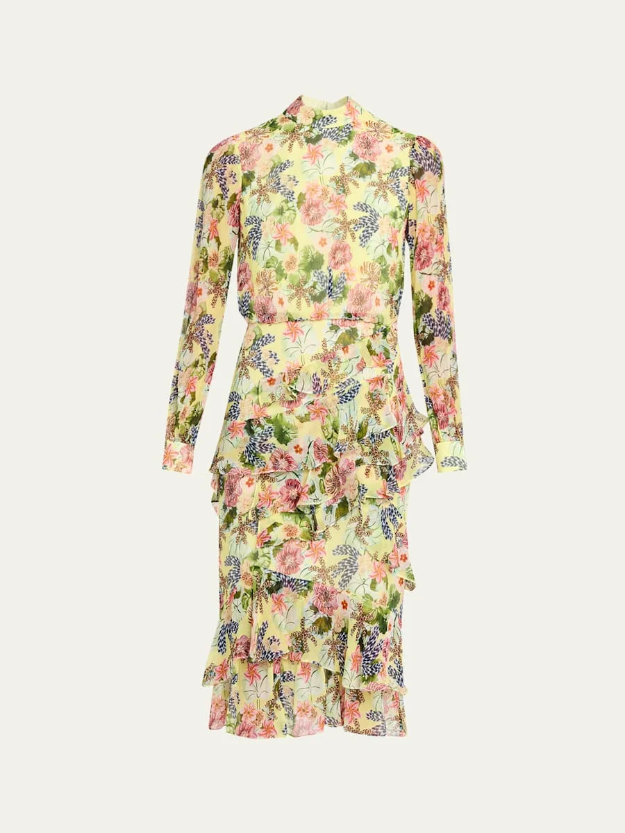 Saloni "Isa" floralprint silk dress with tiered, ruffled details. Mock turtleneck. Long sleeves. Slim silhouette. Hidden back zip. Flounce hem. Midi length. Imported.