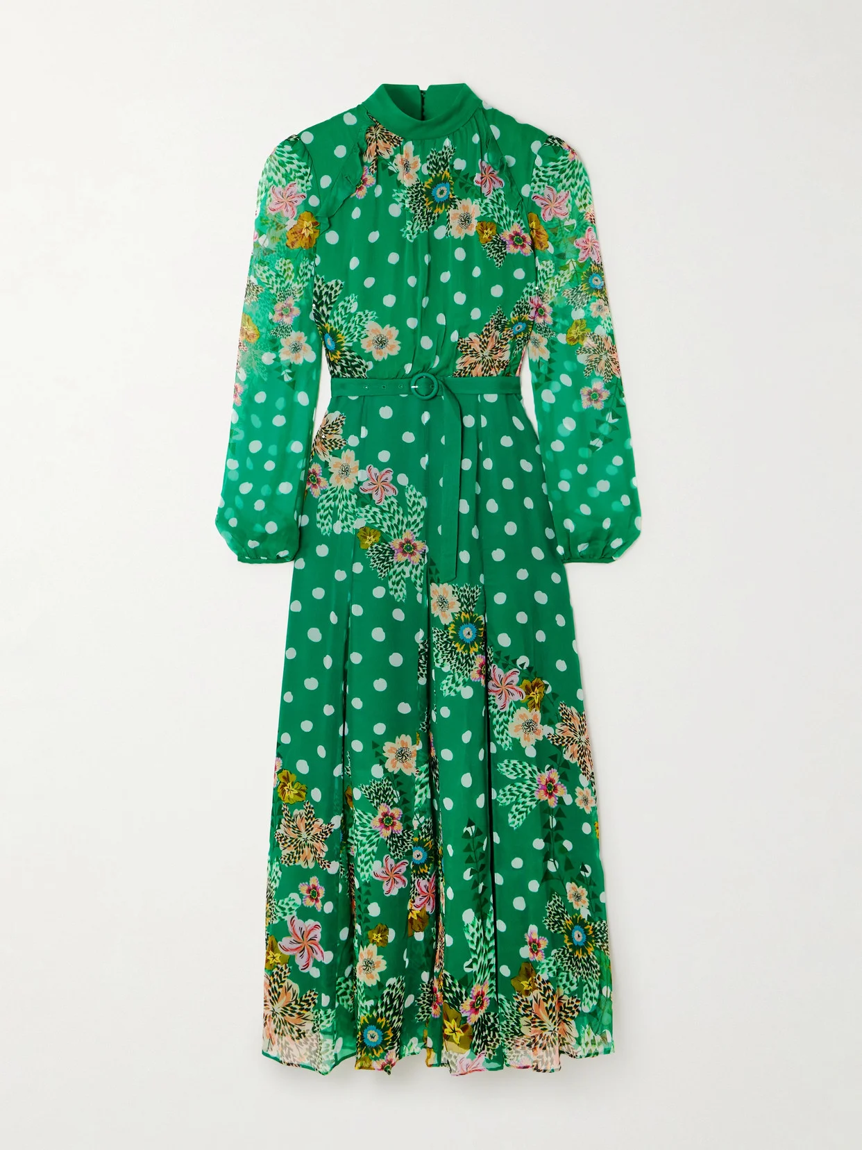 Saloni's designs are created to empower you to "experience the joy of living life in different hues". Decorated in a colorful botanical pattern, this 'Jacqui-B' maxi dress is cut from crepe de chine with puffed sleeves and a gathered high neckline. It has a coordinating belt that cinches the waist and falls to a flowy, split hem.