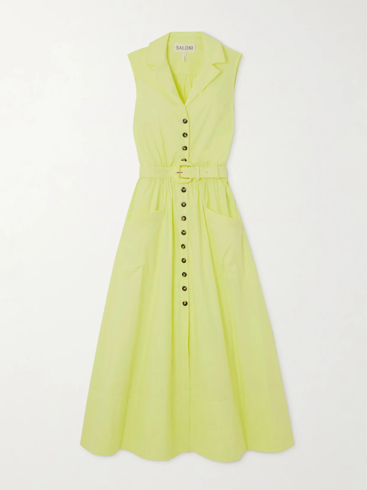 Saloni's 'Kirat' shirt dress reminds us of vintage styles. It's made from a lightweight cotton-blend in a vibrant 'Sunshine' shade and cinches in at the belted waist before falling to a full, gathered midi skirt. The notch collar adds a smart element, while the marled buttons create cool contrast.