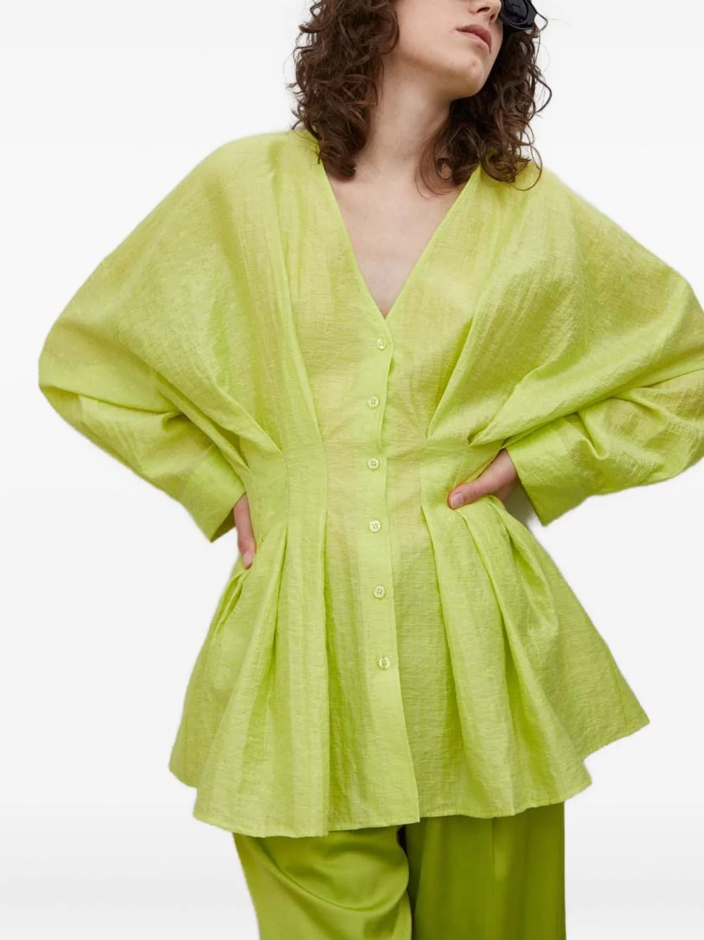 button pleated top Highlights - Green - Front button fastening - V-neck - Long sleeves - Pleated detail Imported Composition TENCEL™ Lyocell (LENZING) 71%, Nylon 29% Washing instructions Read Manufacturer Guidelines