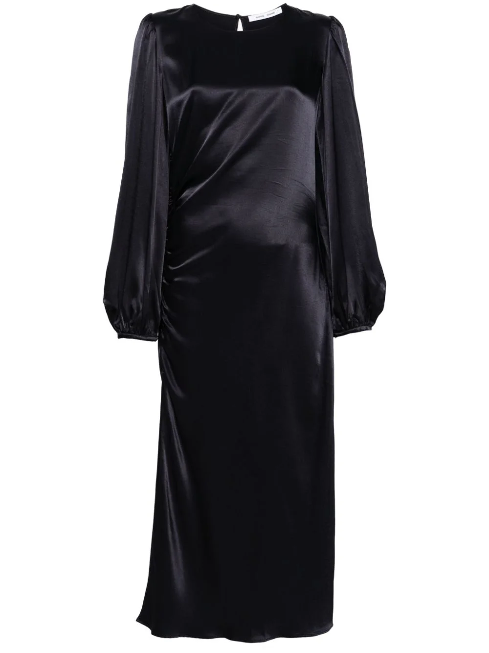 Saelvira ruched midi dress Highlights - Midnight blue - Ecovero™ viscose blend - Satin finish - Asymmetric design - Ruched detailing - Gathered detailing - Round neck - Single rear button fastening - Long sleeves - Side drawstring slit - Straight hem - Mid-length Imported Composition Viscose 100% SIZE & FIT Model measurements Height 5 ft 10 in(1.78 m) Bust/Chest 33.07 in(84 cm) Hips 36.61 in(93 cm) Waist 24.8 in(63 cm) FittingInformation Designed for a relaxed fit, this piece allows for comfort and movement when worn The adjustable drawstring means that you can adjust this piece’s fit to suit your comfort and preference Made from a midweight non-stretch fabric This piece fits true to size – take your usual size
