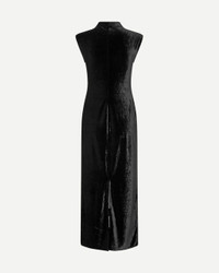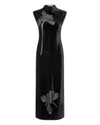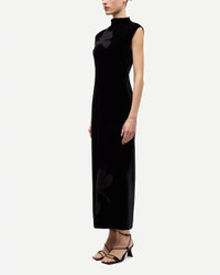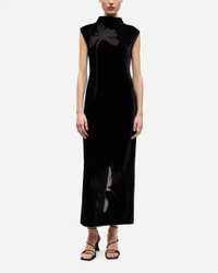 The Sakalani Dress in Elastic Recycled Polyester Blend in the color Black by Samsoe Samsoe is a velvet maxi dress that features sheer floral detailing, high neckline and slit at the back hem. Your perfect evening dinner dress. This product is GRS certified. Each stage of the supply chain has met strict social, environmental, and chemical requirements.