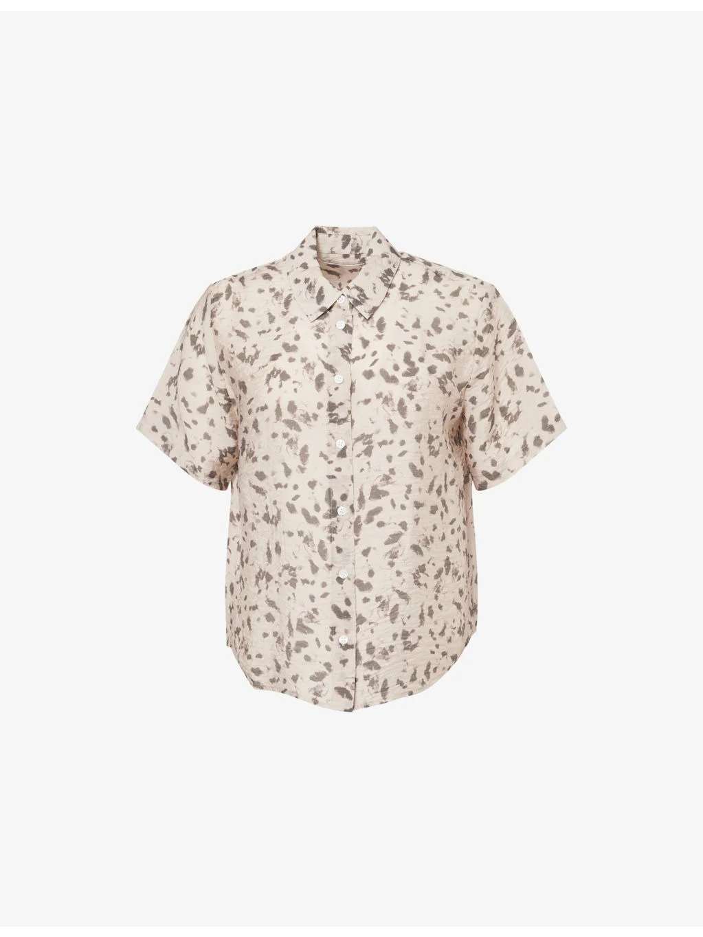 PRODUCT DETAILS - SamsOe & SamsOe woven shirt - 73% modal, 15% polyamide, 12% silk - Exposed button fastening at front - Spread collar - Closed cuffs - Relaxed fit, collar, short sleeves, straight yoke and pleat at back, all-over abstract print, all-over satin texture - Machine wash cold - True to size - Size small: length 24in / 61cm - Model is 5ft 10in/1.78m and wears a size small - Lightweight, stretchy Ref: R04487301