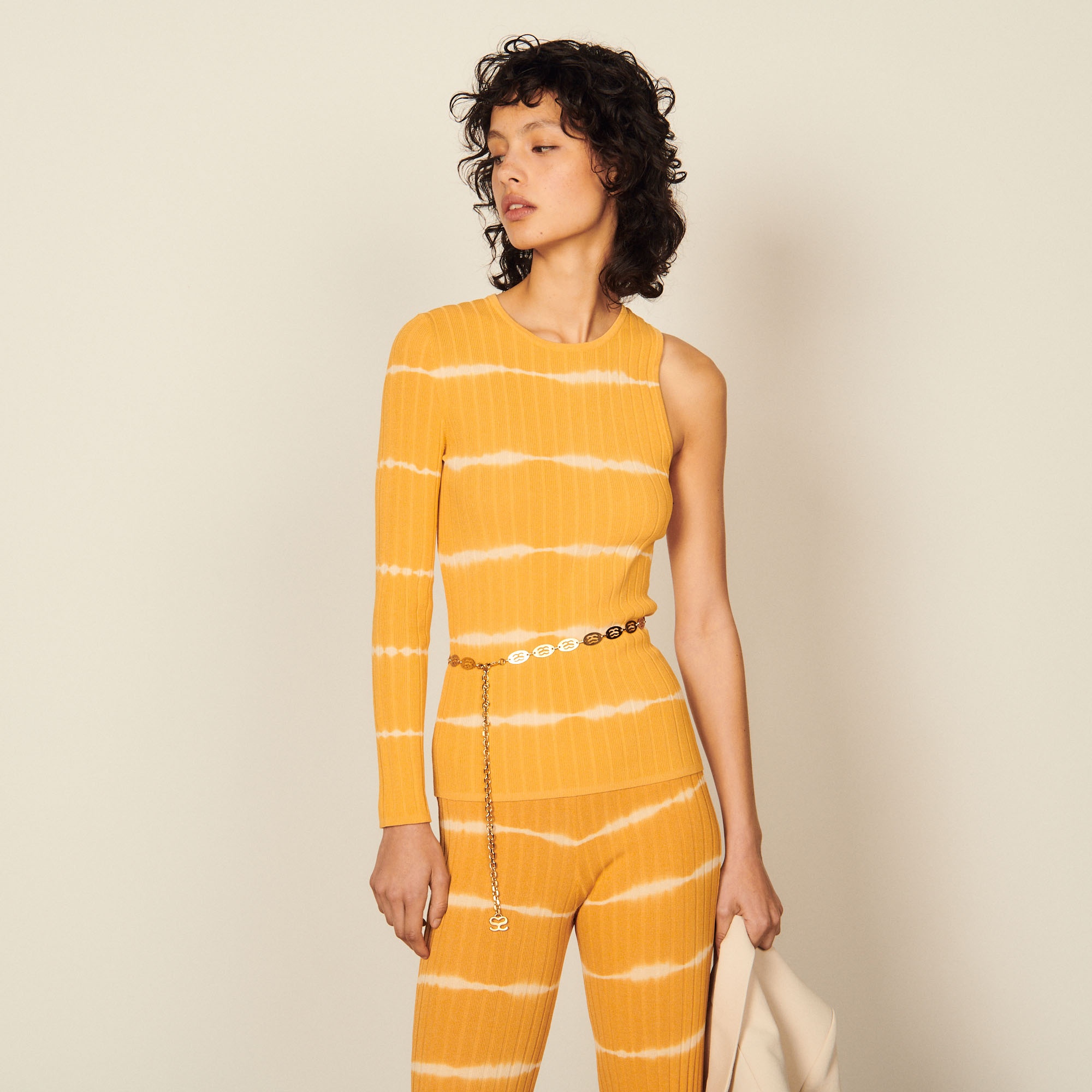 Ribbed sweater with a tie-dye print featuring one long asymmetrical sleeve. • Sandro Women's asymmetrical sweater • One long sleeve • Round neck • Tie-dye print Model is wearing a size 36/UK 8/US 2-4 and is 5'8" Reference : SFPPU01484 MATERIALS Main fabric: 63% viscose, 37% nylon