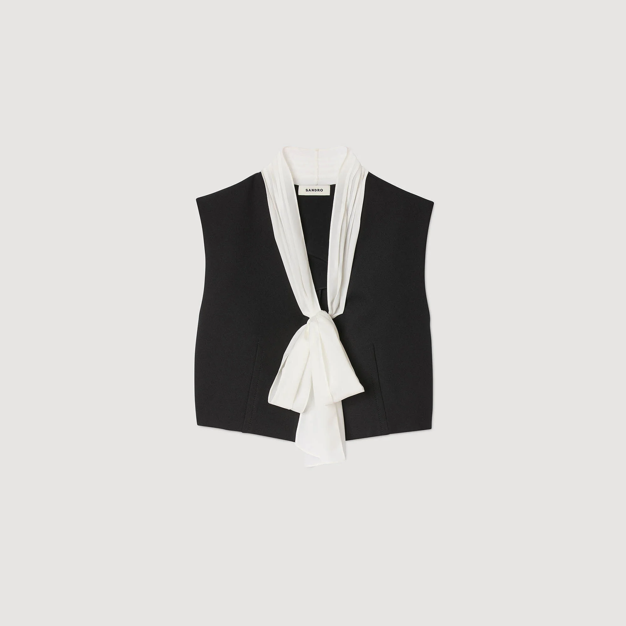 Sleeveless crop top with a contrasting V-neck lavalliere collar. - Sandro Women's sleeveless top - V-neck with lavalliere - Hook fastening - Designed for a cropped fit Reference: SFPTO00825_20 COMPOSITION & CARE Composition - Main material: 91% polyester, 9% elastane - Lining: 100% polyester - Secondary material: 100% polyester Care advice - Do not wash - Do not bleach - Do not tumble dry - Iron at a maximum temperature of 110°C without steam - F/ - Professional dry clean, with hydrocarbon solvent, gentle treatment