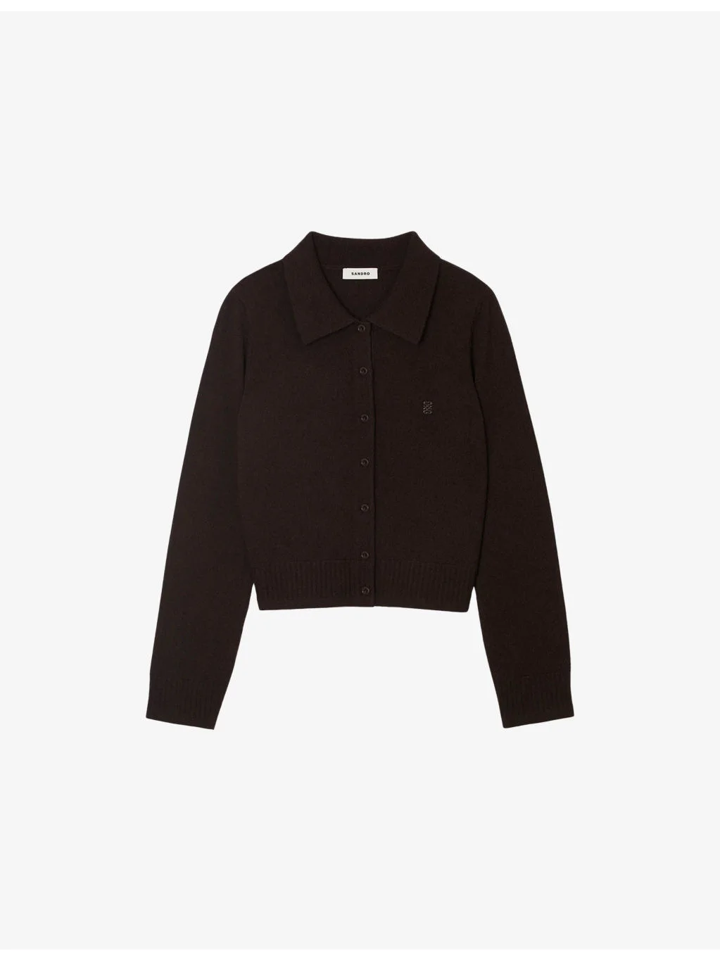 PRODUCT DETAILS - Sandro wool and cashmere cardigan - 90% wool, 10% cashmere - Button fastening - Regular fit, collar, long sleeves, contrast placket, branding to chest, ribbed trims, knitted - Hand wash - True to size - Model is 5ft 9in/1.75m and wears a size small - Lightweight, slight stretch Ref: R04501183