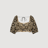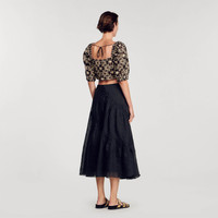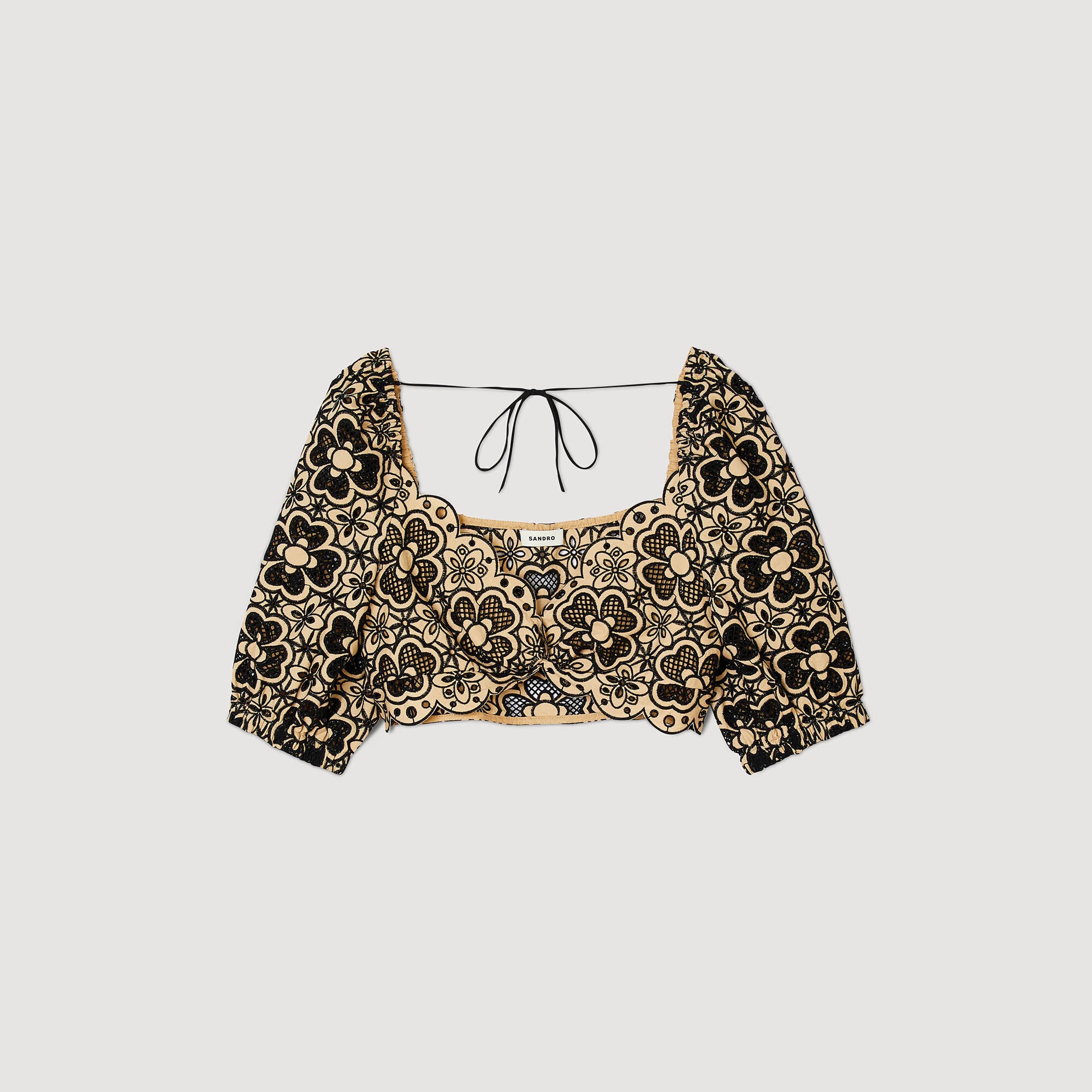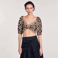Scalloped, two-tone broderie anglaise crop top with full, elasticated short sleeves, smocked straight back and tie fastenings. Sandro Women's eyelet embroidery crop top Scalloped Short, full sleeves Smocked straight back Ties at the back Twisted front This top matches the skirt . COMPOSITION Main fabric: 100% cotton Lining: 100% cotton Tie: 100% cotton Reference: SFPTO00685_A189