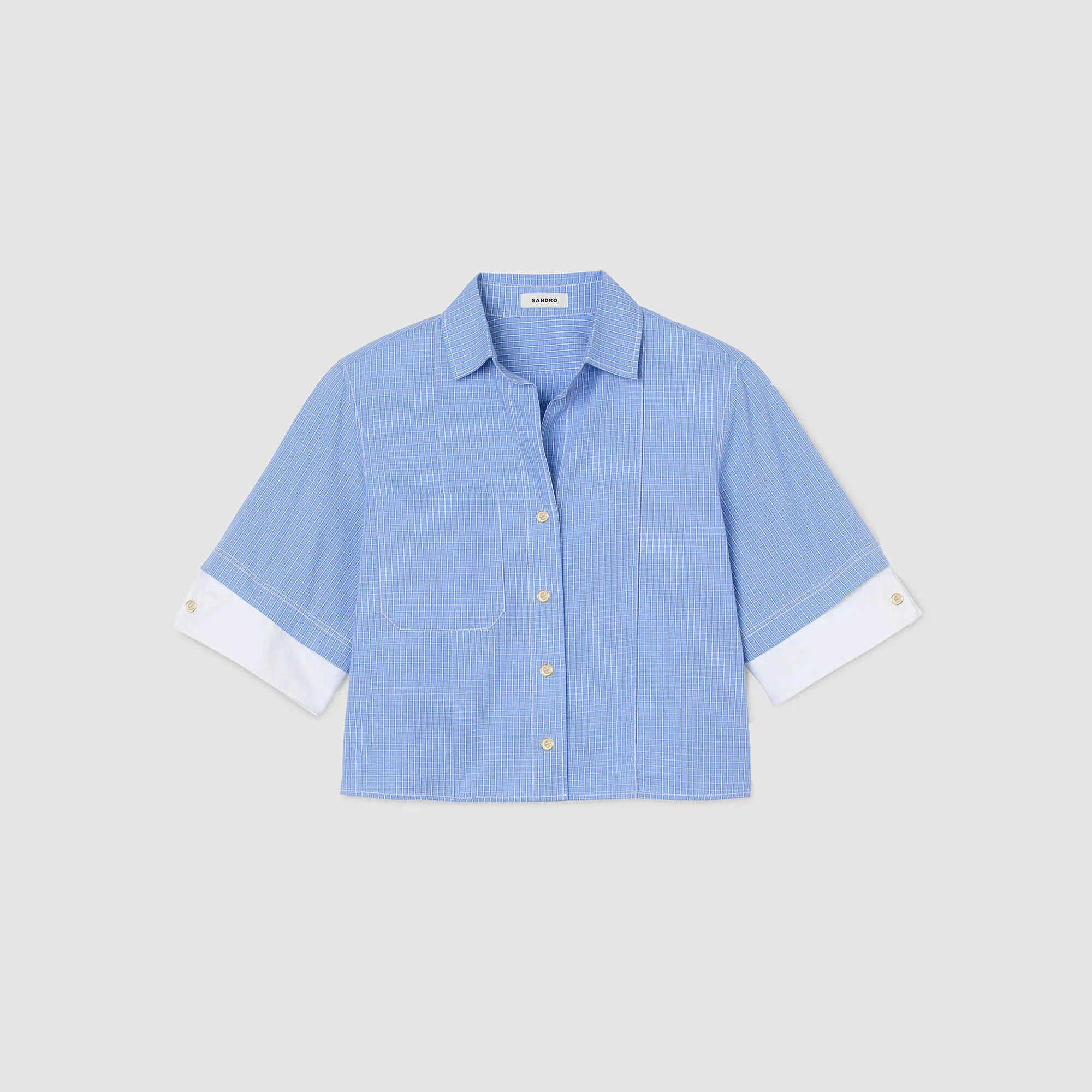 Cropped small-check shirt with a shirt collar, short sleeves, button fastening, and a buttoned triangular tab at the back. - Sandro Women's small-check shirt - Shirt collar - Short sleeves - Button fastening - Patch pocket on chest - Contrasting buttoned cuffs - Buttoned triangular tab at the back - True to size Reference: SFPCM01463_D221 COMPOSITION & CARE Composition - Main material: 100% cotton - Secondary material: 100% cotton Care advice - Regular cycle 30° - Do not bleach - Do not tumble dry - Iron at a maximum temperature of 110°C without steam - F/ - Professional dry clean, with hydrocarbon solvent, gentle treatment