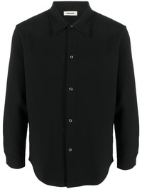 classic-collar button-up shirt Highlights - Black - Classic collar - Front press-stud fastening - Long sleeves - Buttoned-cuff sleeves - Curved hem - When buying this unisex item, keep in mind that it is graded in standard men's sizing. Imported Composition Recycled Polyester 68%, EcoVero Viscose (LENZING) 28%, Spandex/Elastane 4% SIZE & FIT Model measurements Height 6 ft 1 in(1.85 m) Bust/Chest 35.82 in(91 cm) Hips 37.79 in(96 cm) Waist 29.13 in(74 cm) FittingInformation This unisex piece runs small but is designed for a loose fit – take one size up Made from a midweight stretch fabric, this piece offers elasticity and flexibility when worn Washing instructions Hand Wash