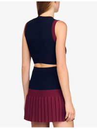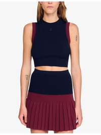 PRODUCT DETAILS - Sandro stretch-knit top - 49% viscose, 49% polyamide, 2% elastane - Slim fit, round neck, sleeveless, contrasting trim to armholes, all-over ribbed knit, monogram embellishment at chest, cropped hem - Hand wash - True to size - Model is 5ft 9in/1.75m and wears a size UK 8 - Lightweight, slight stretch Ref: R04490629