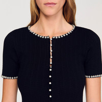 Cropped cardigan with round neck, short sleeves and button fastening, adorned with contrasting embroidered pearls. - Sandro Women's cropped cardigan - Round neck - Button fastening - Short sleeves - Embroidered pearls - Designed for a cropped fit Reference: SFPCA01264_20 COMPOSITION & CARE Composition - Main fabric: 50% viscose, 48% polyamide, 2% elastane Care advice - Hand wash - Do not bleach - Do not tumble dry - Iron at a maximum temperature of 110°C without steam - F - Professional dry clean, with hydrocarbon solvent, normal treatment