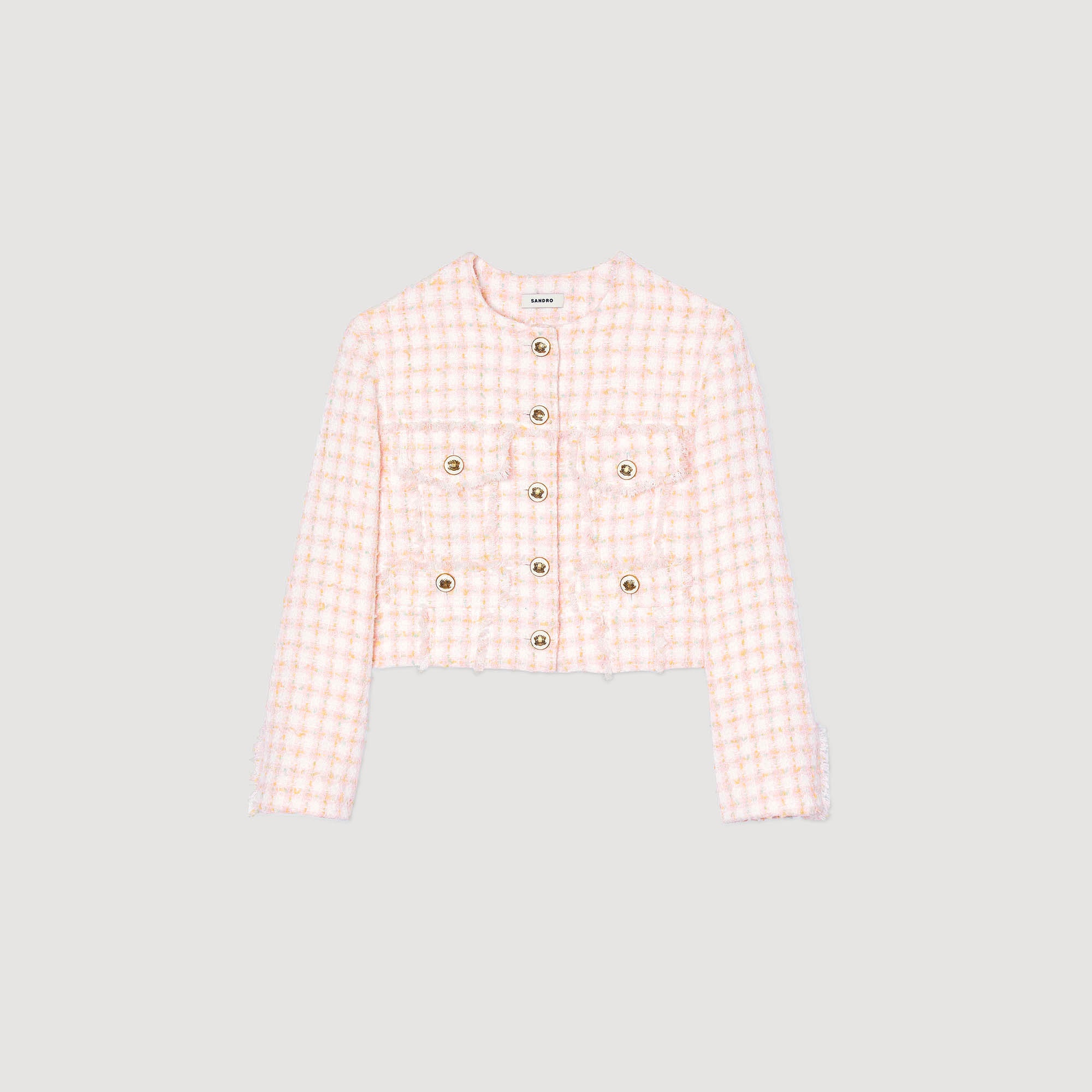 Cropped decorative tweed jacket with long sleeves, a decorative button fastening and fringed trims. Sandro Women's cropped tweed jacket Round neck Long sleeves Flap pockets Fringed trims Button fastening This jacket matches the shorts Reference : SFPVE00979 MATERIALS Main fabric: 100% polyester Braid: 42% viscose, 35% cotton, 16% polyester, 4% Metalized fibers, 3% polyamide Lining: 100% viscose Pocket lining: 100% cotton