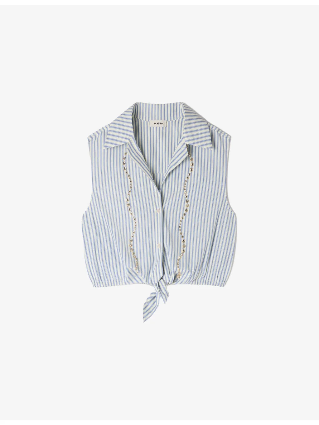 PRODUCT DETAILS - Sandro cotton-blend shirt - 55% polyester, 45% cotton - Exposed button fastening at front - Regular fit, collared, V-neck, sleeveless, rhinestone embellishment, cropped length, tie-detail at the front, elasticated hem - Machine wash at 30°C - True to size - Model is 5ft 11in/1.80m and wears a size UK 8 - Midweight, non-stretch Ref: R04618193