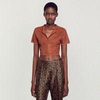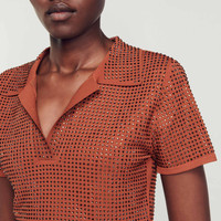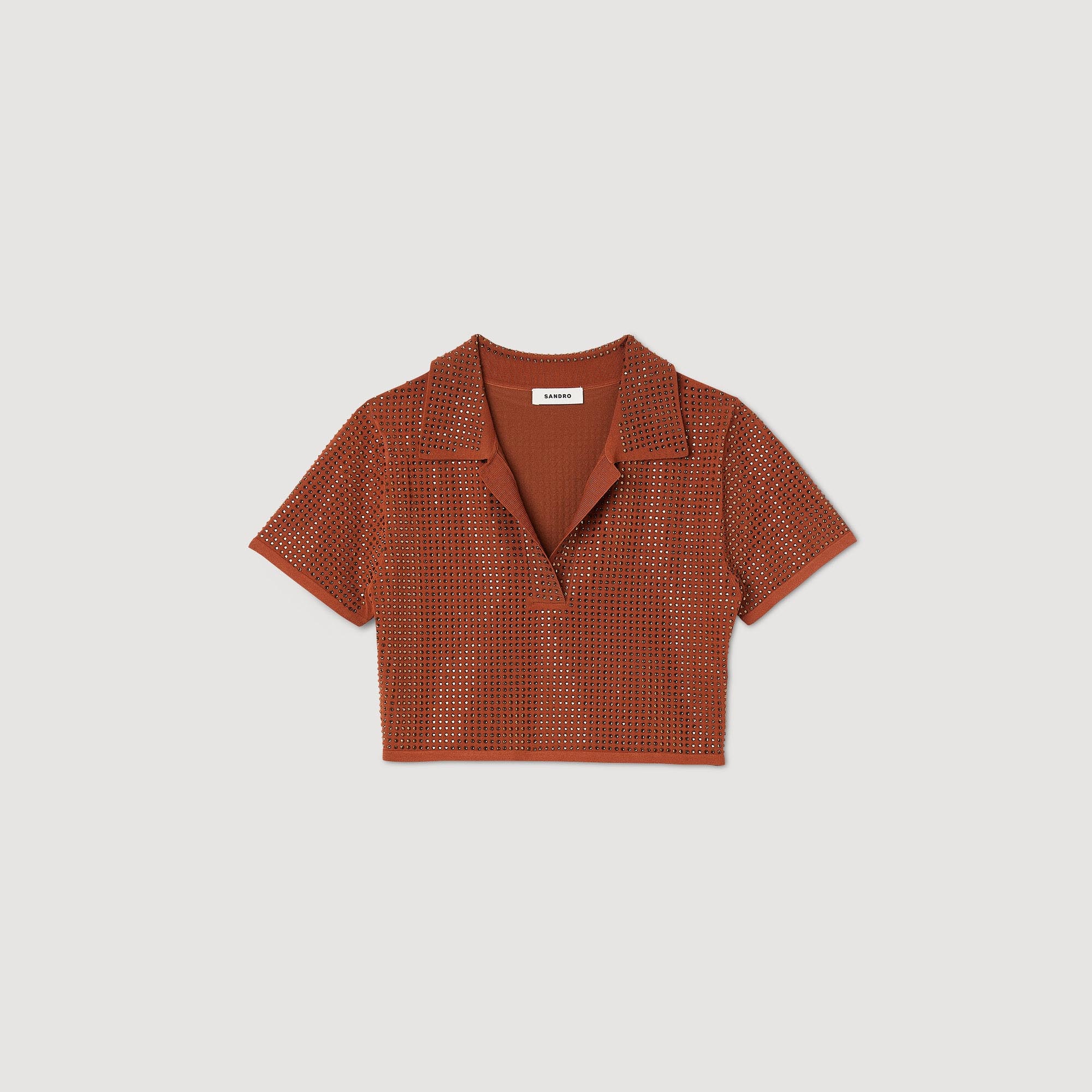 Cropped polo sweater with short sleeves and tone-on-tone all-over rhinestone embellishment. Sandro Women's cropped sweater All-over rhinestones Open polo collar Short sleeves The model is 5'11" tall and wears a size 1 FR / 4 US The viscose in this item is made of cellulose from sustainably managed forests. Reference : SFPPU01951 MATERIALS Main fabric: 61% viscose, 24% polyamide, 15% polyester Diamante: 100% glass