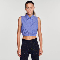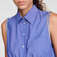 Cropped sleeveless shirt with thin stripes, a collar, a button fastening, an elasticated waist, and armholes embellished with rhinestones. Sandro Women's cropped shirt Striped print Sleeveless Rhinestones at the armholes Button fastening Elasticated waist The model is 180 cm / 5'11 tall and wears a size 1 FR / 8 UK COMPOSITION Main fabric: 64% cotton, 31% polyamide, 5% elastane Buttons: 100% nacre Reference: SFPCM00959_D251