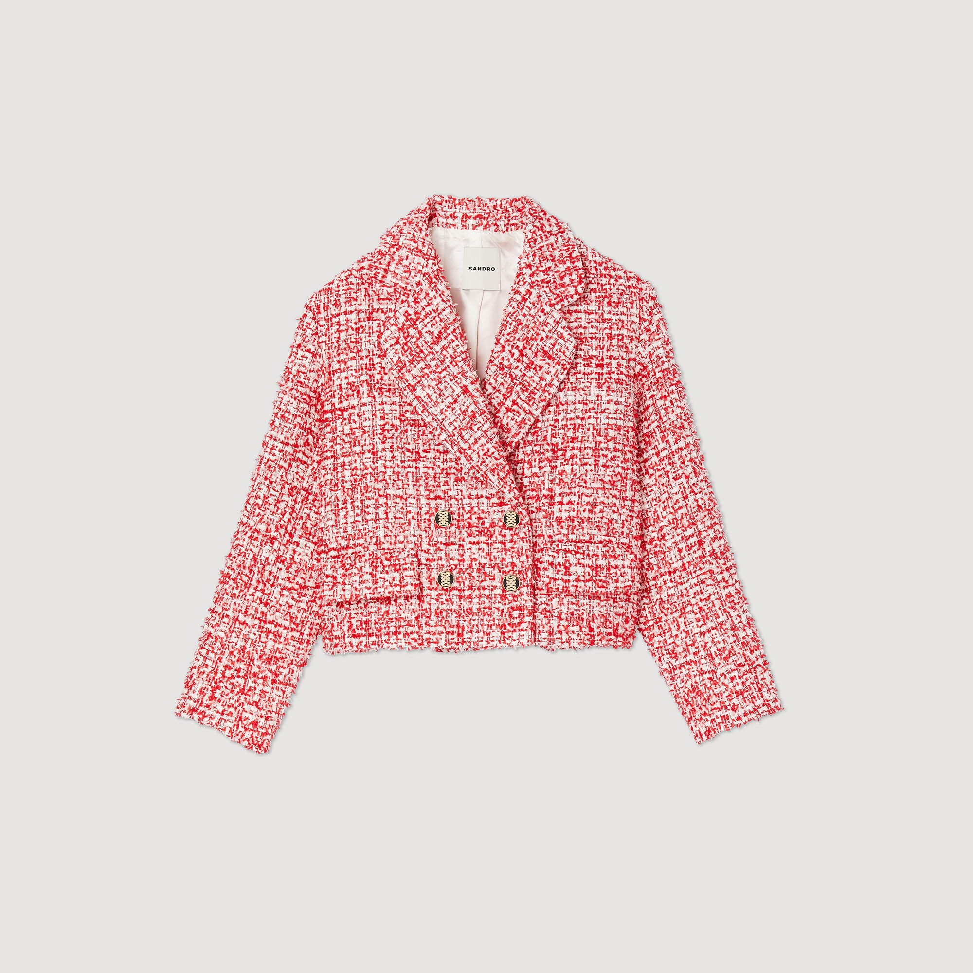 Cropped tweed jacket with a tailored collar, long sleeves, and a double-breasted button fastening. • Sandro Women's cropped tweed jacket • Cropped cut, loose fit • Long sleeves with faux slits at the cuffs • Double-breasted fastening • Branded buttons The model is 5'10" tall and wears a size 36 FR / 4 US Reference : SFPVE00796 MATERIALS Main fabric: 95% polyester, 3% cotton, 1% viscose, 1% metallic fibres Under collar: 100% polyester Lining: 100% viscose Pocket lining: 100% cotton