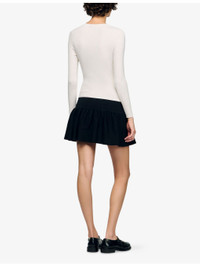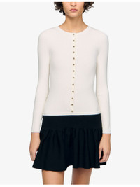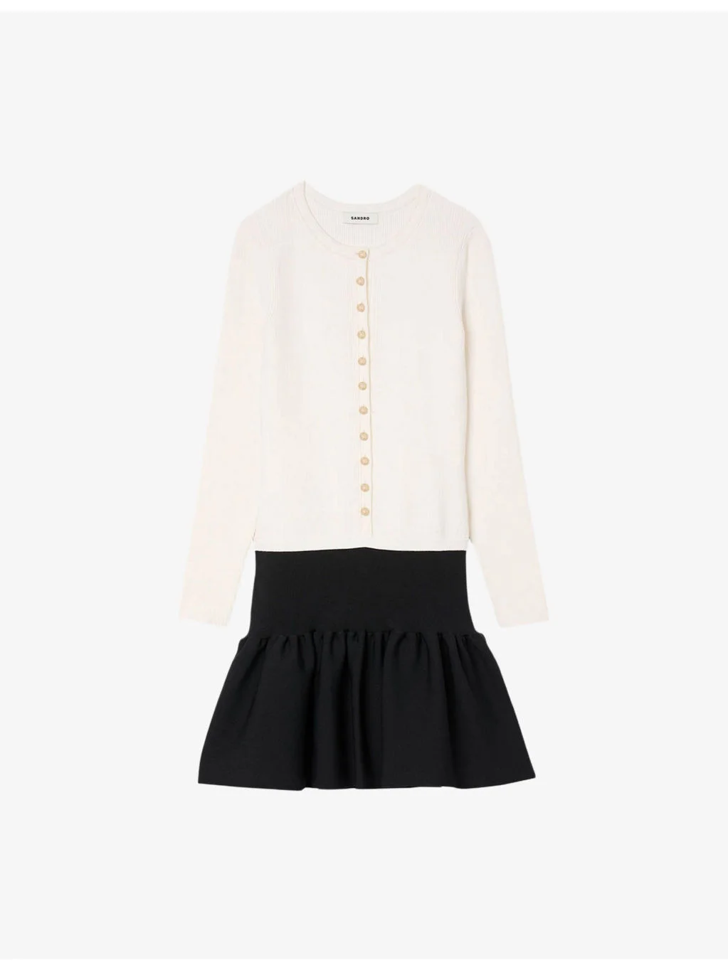 PRODUCT DETAILS - Sandro stretch-knit dress - 41% acrylic, 41% wool, 16% polyamide, 2% elastane - Exposed button fastening at front - Slim fit, round neck, long sleeves, button placket at the front, two-tone mini skirt - Hand wash - True to size - Model is 5ft 9in/1.75m and wears a size UK 8 - Midweight, non-stretch Ref: R04501124