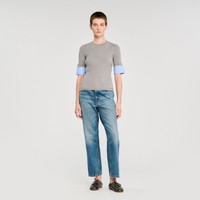 Fine rib knit sweater with short sleeves and contrasting poplin inserts. - Sandro Women's fine knit sweater - Round neck - Short sleeves - Contrasting poplin inserts - Designed for a slim fit Reference: SFPPU02319_24 COMPOSITION & CARE Composition - Main fabric: 45% acrylic, 40% wool, 15% polyamide - Wrist: 100% cotton Care advice - Hand wash - Do not bleach - Do not tumble dry - Iron at a maximum temperature of 110°C without steam - F - Professional dry clean, with hydrocarbon solvent, normal treatment