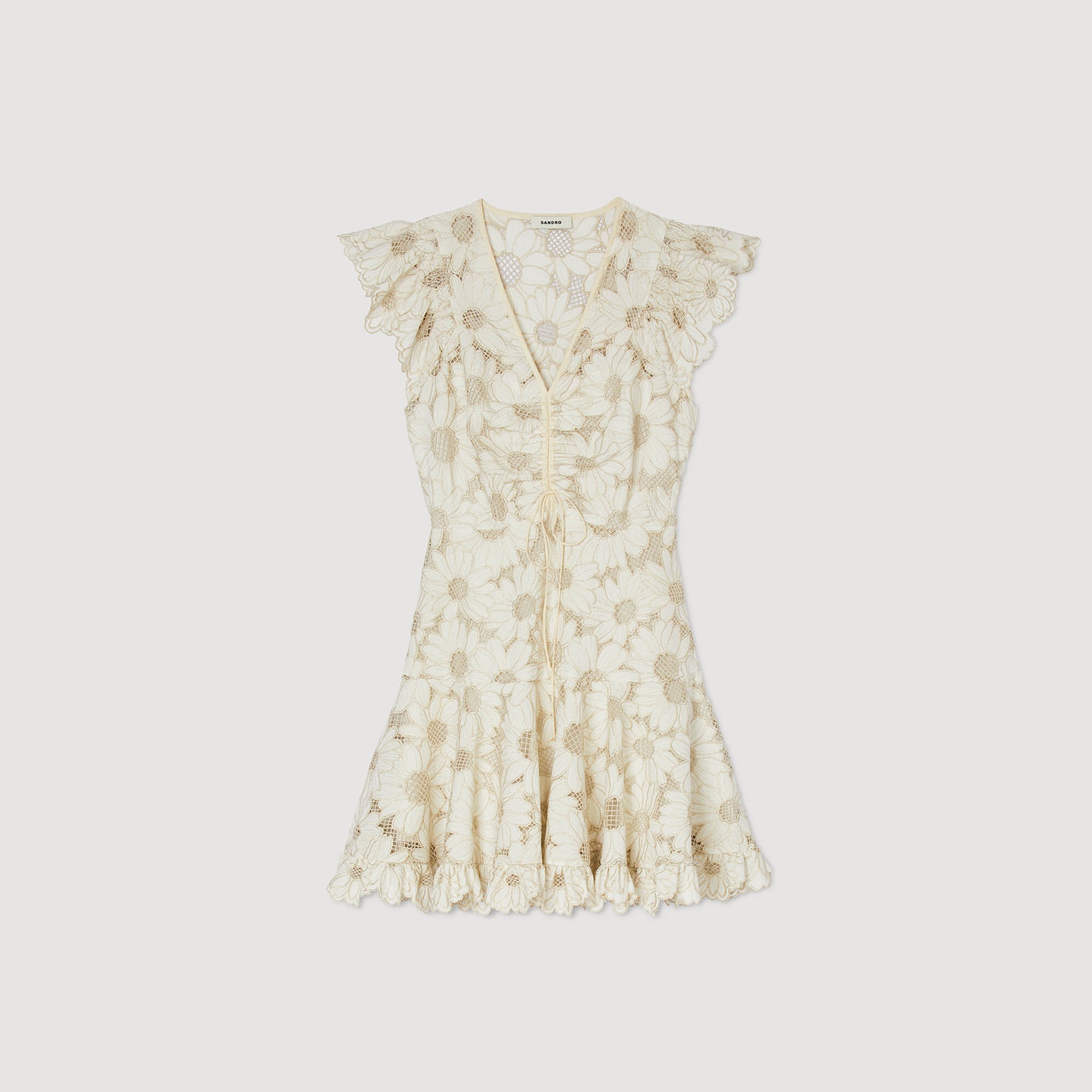 Short dress in daisy guipure, featuring a V-neck with drawstrings, short sleeves and a scalloped and ruffled flared skirt. Sandro Women's short dresses Daisy guipure V-neck with drawstrings Ruffled and scalloped short sleeves Scalloped flared skirt with ruffles Zip fastening COMPOSITION Main fabric: 56% polyester, 37% cotton, 7% metalized fibers Neckline: 78% lyocell, 15% polyamide, 7% linen Body lining: 100% cotton Reference: SFPRO03558_A235