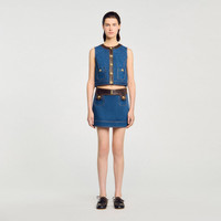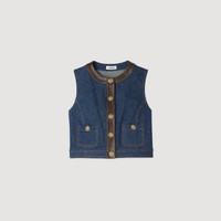 Cropped denim top with contrasting leather trim at the neckline and placket, with buttoned patch pockets and a button fastening. - Sandro Women's cropped denim and leather top - Sleeveless - Button fastening - Buttoned patch pockets - Round neck - Washed denim - Designed for a cropped fit Reference: SFPTO00833_470 COMPOSITION & CARE Composition - Main material: 100% cotton - Leather: lambskin leather Care advice - Do not wash - Do not bleach - Do not tumble dry - Do not iron - F/ - Professional dry clean, with hydrocarbon solvent, gentle treatment