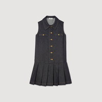 Sleeveless mini dress in raw denim with contrasting topstitching, featuring a shirt collar and button fastening with decorative buttons. - Sandro Women's mini denim dress - Shirt collar - Sleeveless - Hip cutouts - Pleated skirt - Mock welt chest pockets with button - True to size Reference: SFPRO04394_D324 COMPOSITION & CARE Composition - Main material: 100% cotton Care advice - Do not wash - Do not bleach - Do not tumble dry - Iron at a maximum temperature of 110°C without steam - F/ - Professional dry clean, with hydrocarbon solvent, gentle treatment