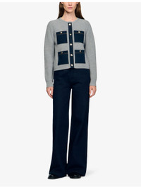 PRODUCT DETAILS - Sandro wool cardigan - 100% wool; pockets 100% cotton - Button fastening - Regular fit, round neck, long sleeves, denim chest pockets, denim front pockets, ribbed texture - Hand wash - True to size - Model is 5ft 9in/1.75m and wears a size UK 8 - Midweight, slight stretch Ref: R04490636
