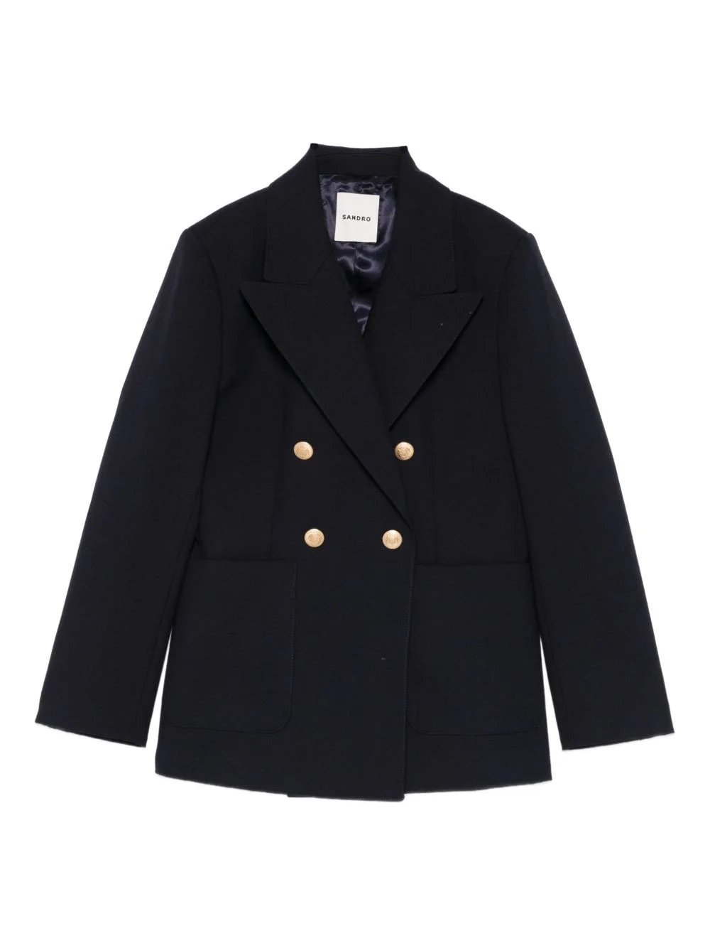 double-breasted button blazer Highlights - Blue - Double-breasted - Metal buttons - Tailored collar - Long sleeves - Two front patch pockets Imported Composition Outer: Virgin Wool 75%, Cotton 25% Lining: Viscose 100%, Cotton 100% Washing instructions Dry Clean Only