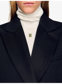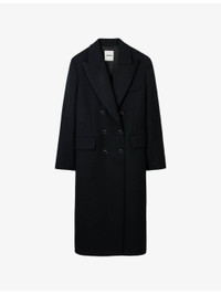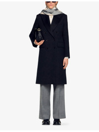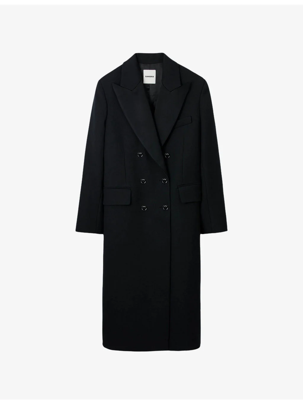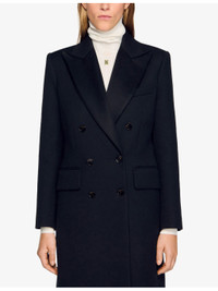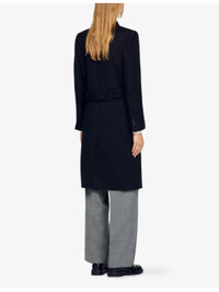 PRODUCT DETAILS - SANDRO woven coat - 52% cotton, 31% polyester, 17% virgin wool - Exposed button fastening at front - Double-breasted, peak lapels, one welt pocket at chest, two flap pockets at front, darted, buttoned martingale at the back, single vent at back - Dry clean - True to size - Model is 5ft 9in/1.75m and wears a size UK 8 - Midweight, non-stretch Ref: R04501227