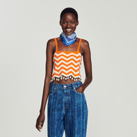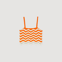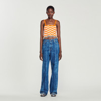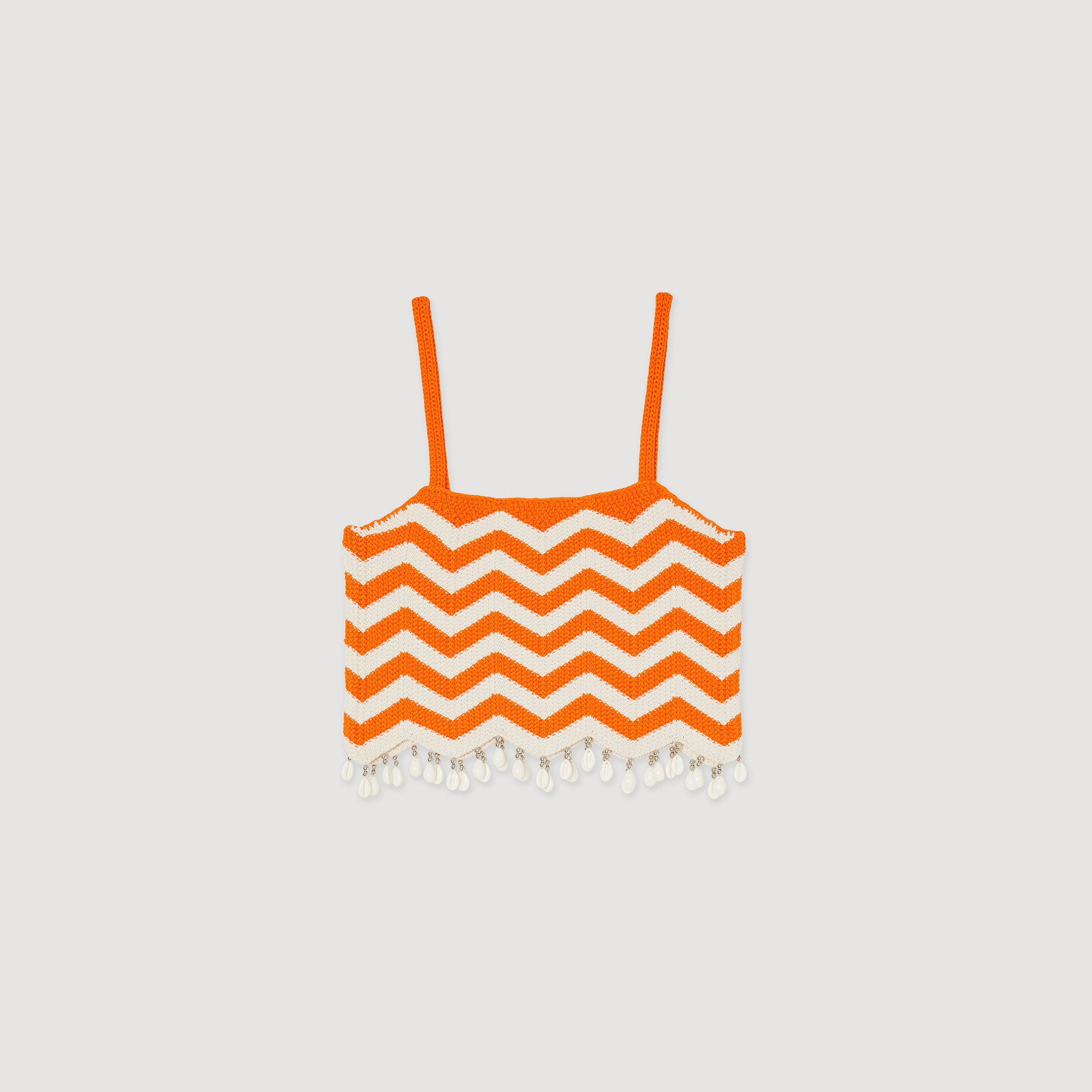 Cropped knit top with a two-tone wave pattern, narrow straps, scalloped edges, and drop beads and shells on the bottom. Sandro Women's cropped knit top Narrow straps Wave motifs Drop beads and shells on the bottom Scalloped hem The model is 5'11" tall and wears a size 1 FR / 4 US Reference : SFPPU01919 MATERIALS Main fabric: 63% viscose, 37% polyamide Ornaments: 100% acrylic Beads: 100% Acrylonitrile-butadiène-styrèn