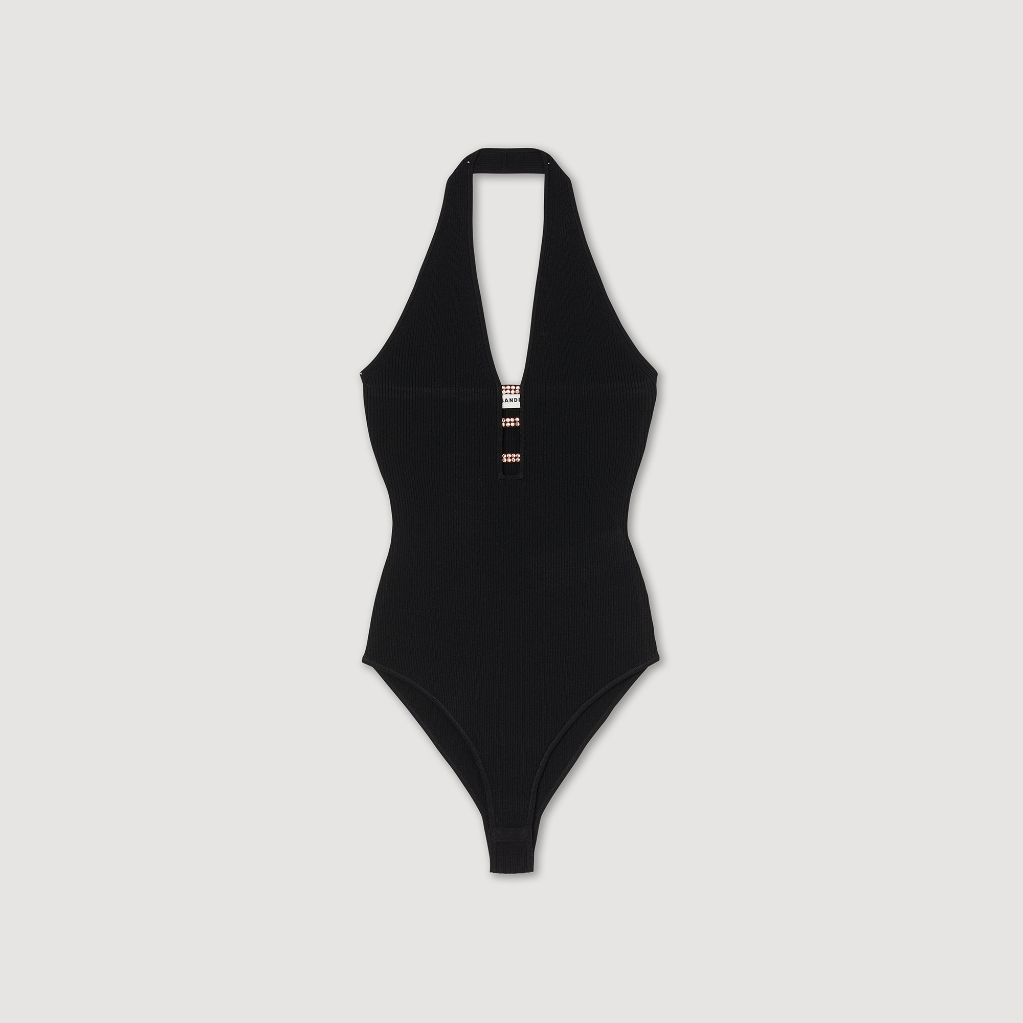 Backless ribbed knit bodysuit with a high-leg cut and a plunging open neckline embellished with rhinestone jewels. Sandro Women's knit bodysuit Backless Plunging neckline 3 jewels set with rhinestones The viscose in this item is made of cellulose from sustainably managed forests. Reference : SFPPU01895 MATERIALS Main fabric: 64% viscose, 21% polyamide, 15% polyester Diamante: 100% glass Lining: 64% viscose, 21% polyamide, 15% polyester