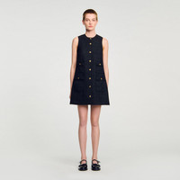 Mini sleeveless tweed dress with round neckline, button fastening and patch pockets with flaps. - Sandro Women's mini tweed dress - Shift dress - Round neck - Sleeveless - Button fastening with gold buttons - Flap pockets - Runs small, sizing up recommended Reference: SFPRO04000_20 COMPOSITION & CARE Composition - Main material: 100% polyester - Lining: 100% polyester - Fusible interfacing: 100% polyester Care advice - Do not wash - Do not bleach - Do not tumble dry - Do not iron - F/ - Professional dry clean, with hydrocarbon solvent, gentle treatment