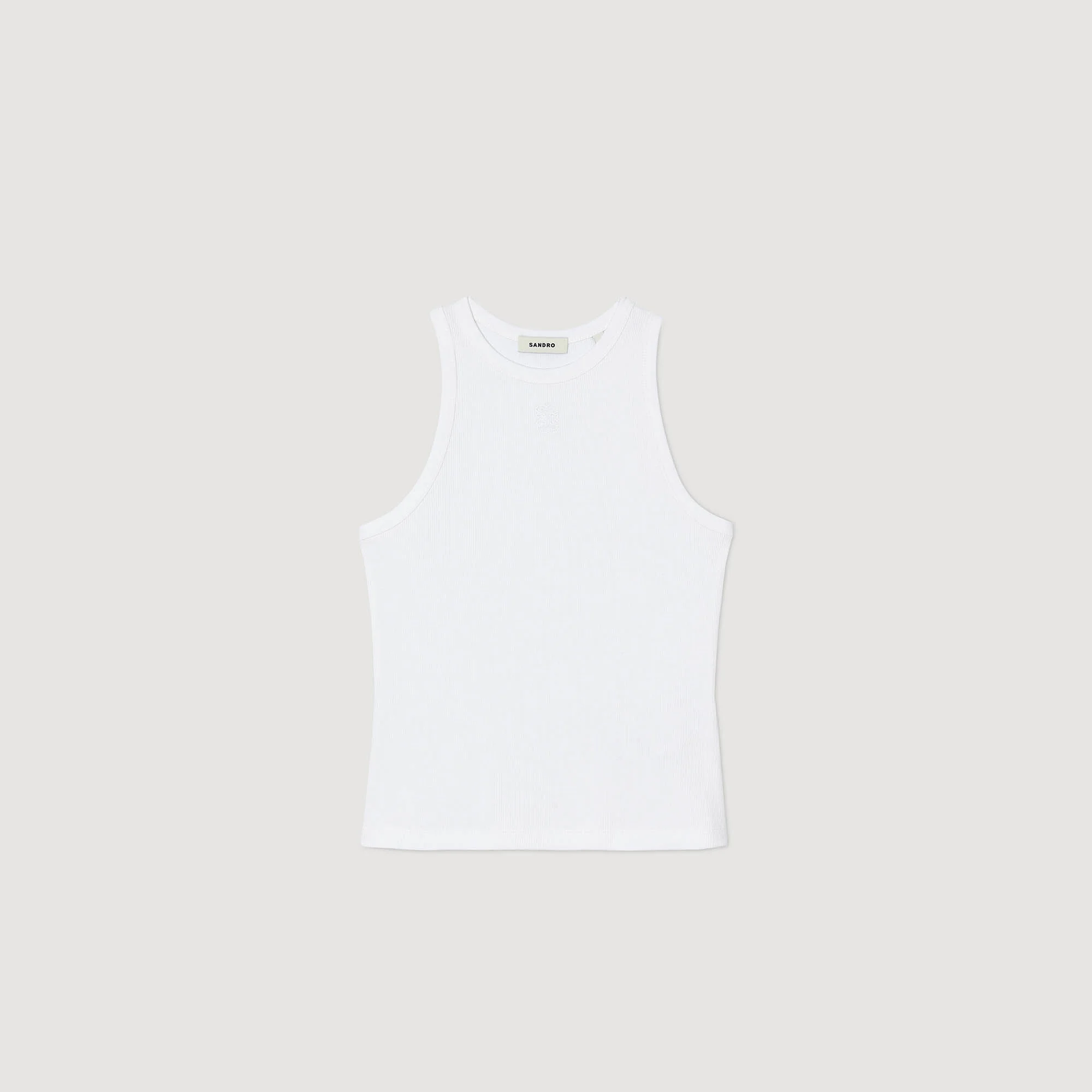Vest top with round neck and American-style armholes, embellished with embroidery on the chest. Sandro Women's vest top American armholes Round neck SANDRO embroidery The model is 178 cm / 5'10 tall and wears a size 1 FR / 8 UK COMPOSITION Main fabric: 100% cotton Embroidery: 100% viscose Rib: 100% cotton Reference: SFPTS01459_10