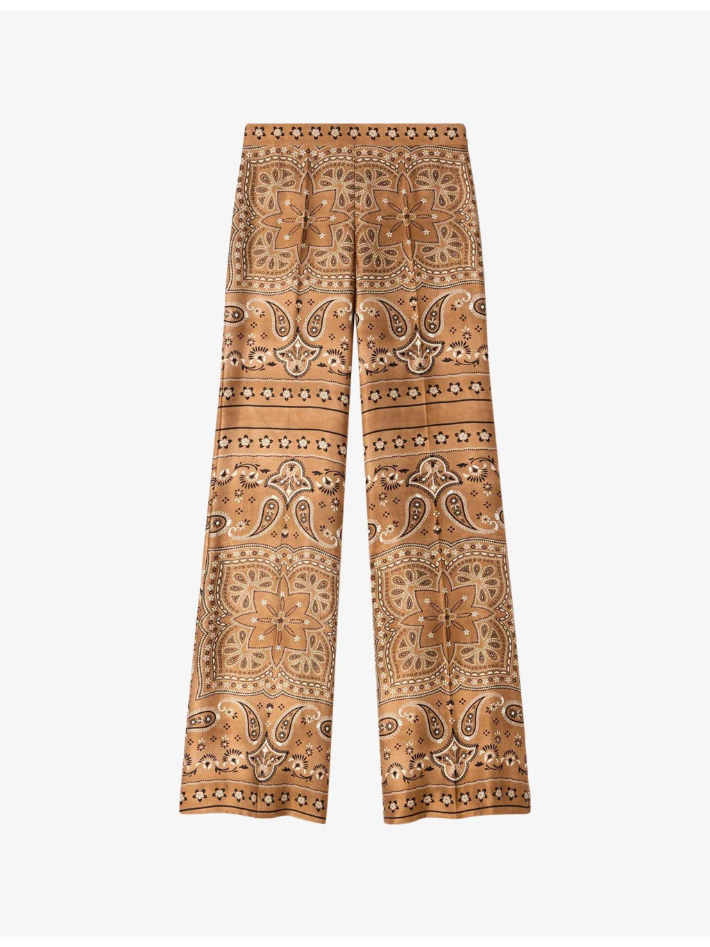 PRODUCT DETAILS - Sandro woven trousers - 100% viscose - Concealed zip fastening at side - Regular fit, mid-rise, all-over bandana print, flared leg - Dry clean - True to size - Model is 5ft 9in/1.75m and wears a size UK 8 - Lightweight, non-stretch Ref: R04598453