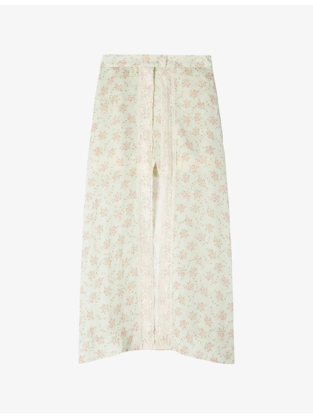 PRODUCT DETAILS - Sandro woven maxi skort - 65% viscose, 35% linen - Button and zip-fly fastening - Regular fit, high-rise, contrast lace trim, all-over floral print - Dry clean - True to size - Model is 5ft 11in/1.80m and wears a size UK 8 - Lightweight, non-stretch Ref: R04598569