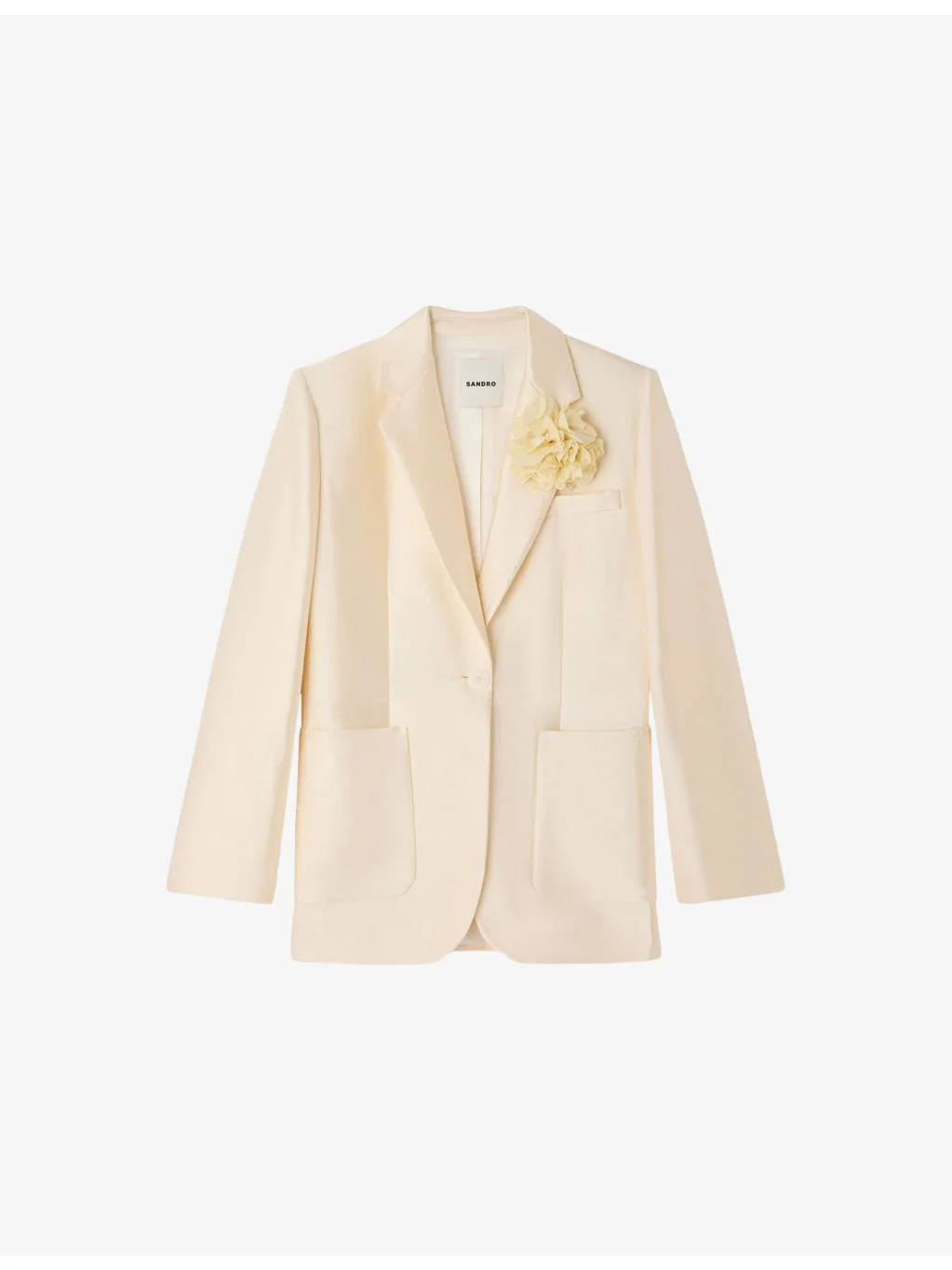 PRODUCT DETAILS - Sandro satin blazer - 50% viscose, 43% cotton, 7% polyamide - Button fastening - Regular fit, notch lapels, single-breasted, long sleeves, side pockets, chest pocket, flower embellishment - Dry clean - True to size - Model is 5ft 9in/1.75m and wears a size UK 8 - Midweight, non-stretch Ref: R04598566