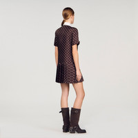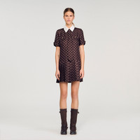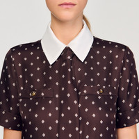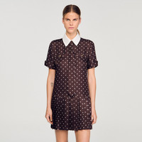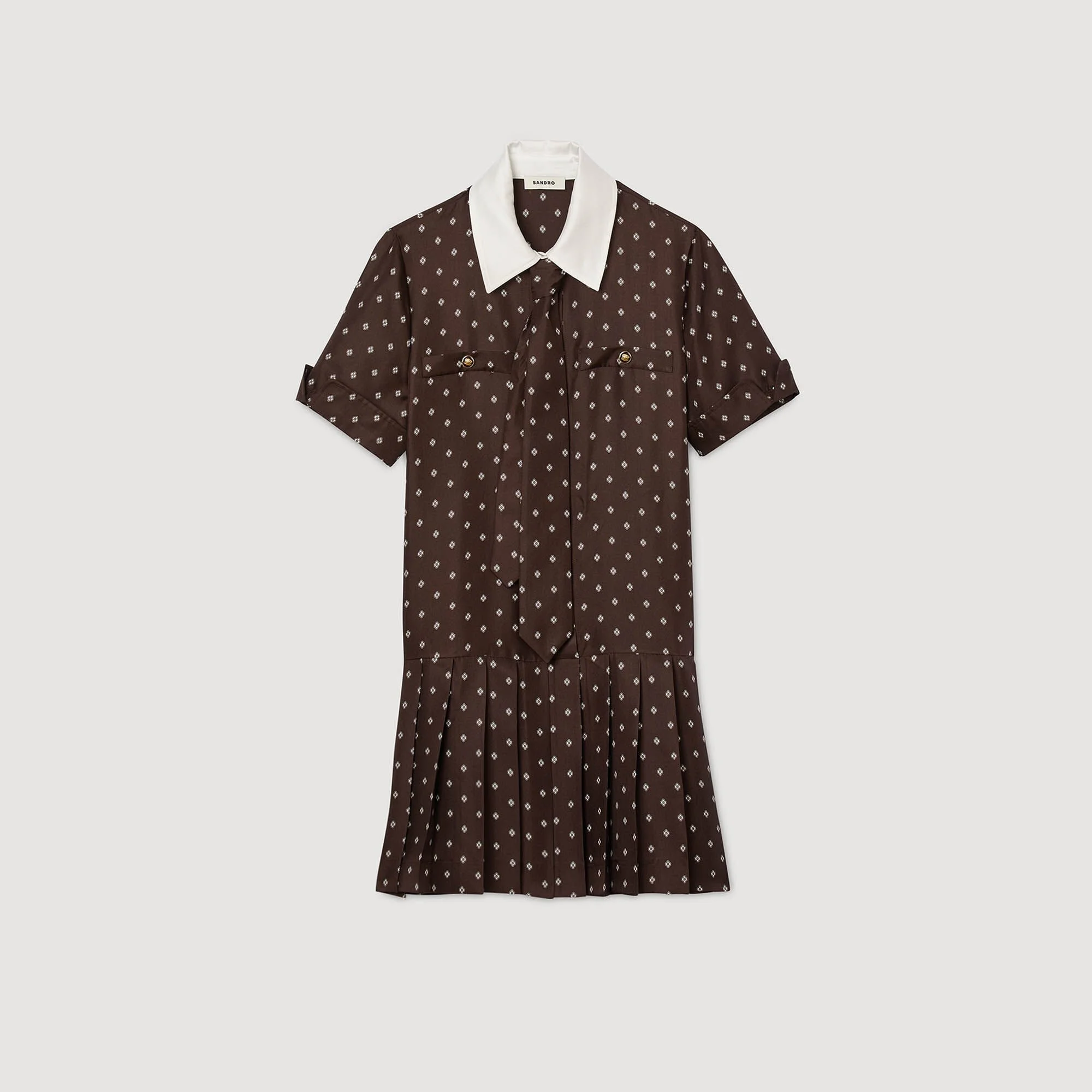 Mini, fluid satin-effect dress with a graphic print, featuring a contrasting shirt collar with tie, short sleeves with button tab and a pleated skirt. - Sandro Women's mini satin-effect dress - Geometric print - Contrasting shirt collar - Short sleeves - Mock welt pockets - Pleated skirt - Designed for a loose fit Reference: SFPRO04601_A394 COMPOSITION & CARE Composition - Main material: 100% polyester - Collar: 100% polyester Care advice - Do not wash - Do not bleach - Do not tumble dry - Iron at a maximum temperature of 110°C without steam - F/ - Professional dry clean, with hydrocarbon solvent, gentle treatment